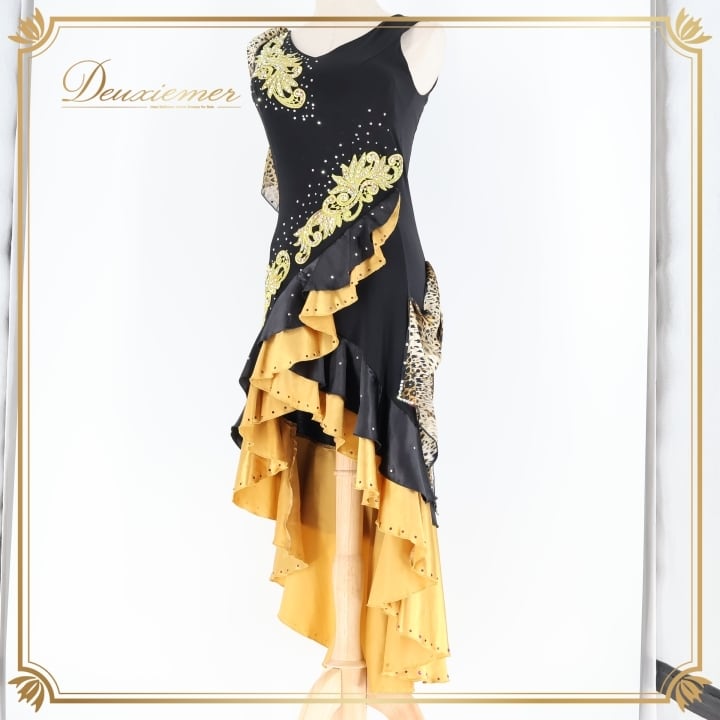 社交ダンス 衣装 ラテン ドレス ワンピース 黒 金 デモ 競技 パーティ 発表会 フリル レース 軽い ヒョウ柄 パーティドレス ブラック系 ゴールド系 フォーマル パーティー ステージ衣装 エレガント おしゃれ パーティーコスチューム レディース 競技用