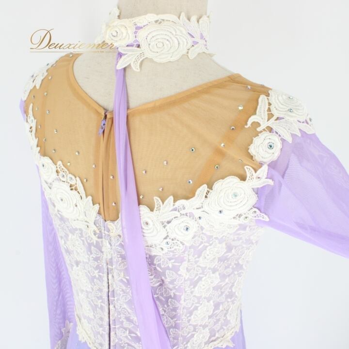 社交ダンス 衣装 スタンダード ドレス ワンピース パーティドレス パープル系 ブルー系 ホワイト系 U:NA ユーナ レース 長袖 ラインストーン 洗練 花柄 ボリューム 優雅 動き 伸縮性 ポリエステル レーヨン ナイロン ポリウレタン 光 ラインストーン 三層スカート