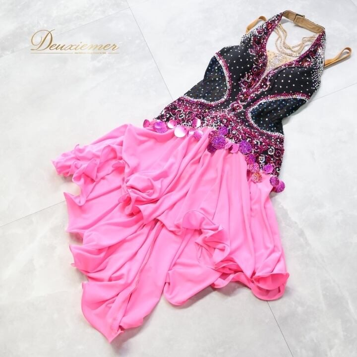社交ダンス 衣装 ラテン ドレス ワンピース 黒 ピンク デモ 競技 ダンス パーティ 発表会 フリル 豪華 かわいい 華やか 日本製 ブラック系 ピンク系 ドレッシー 発表 おしゃれ 踊りやすい パーティー 社交ダンス衣装 レディース ステージ衣装