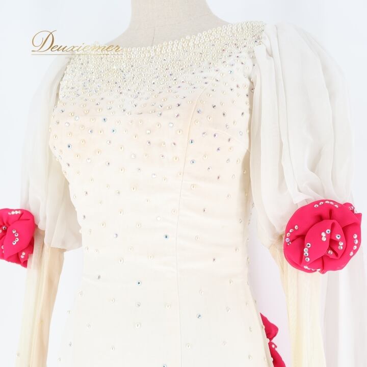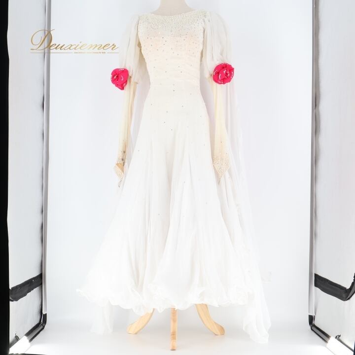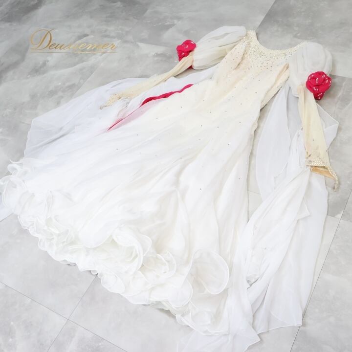 社交ダンス 衣装 スタンダードドレス ワンピース ドレス ホワイト 白 フリル フロート レース 花 ピンク デモ 競技 ダンス パーティ 発表会 パール ホワイト系 おしゃれ デザイン 女性用 競技衣装 上品 パーティー用 ドレスアップ