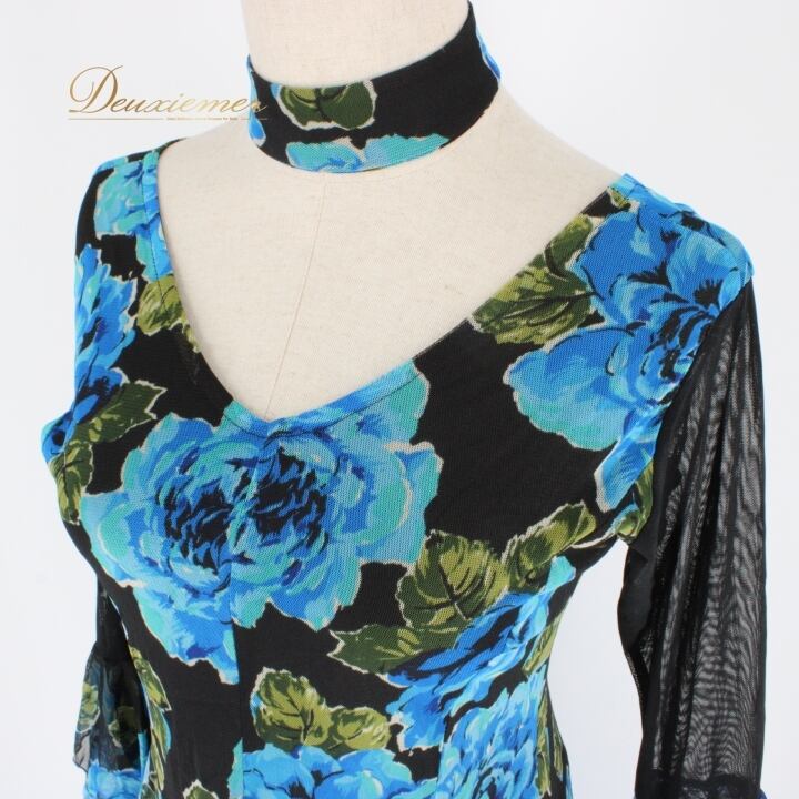 社交ダンス 衣装 スタンダード ドレス ワンピース パーティドレス prima boutique プリマブティック 青 黒 緑 ブラック系 ブルー系 グリーン系 薔薇 バラ 花柄 おしゃれ 可愛い フォーマル 伸縮性あり レディース チョーカー付き ブラックドレス パーティ対応 ドレスアップ セクシー エレガント プリーツ ステージ衣装 おすすめ 人気 バラ柄 ショッピング
