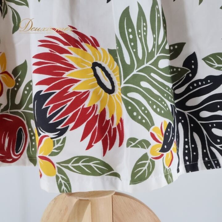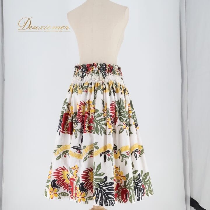 フラダンス 衣装 パウスカート ホワイト系 プルメリア柄 ラウアエ柄 イプ柄 イプヘケオレ柄 かわいい 華やか 鮮やか 明るい 爽やか 白 黄 緑 赤 ハワイアン アロハ ハワイアンプリント フラ ダンス レッスン 練習 カラフル おしゃれ 楽しい リゾート