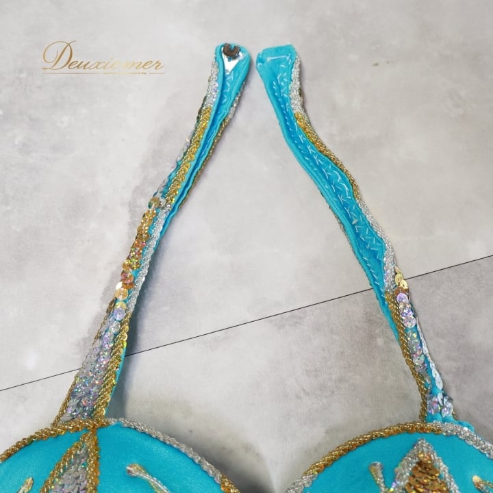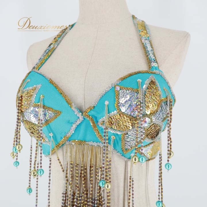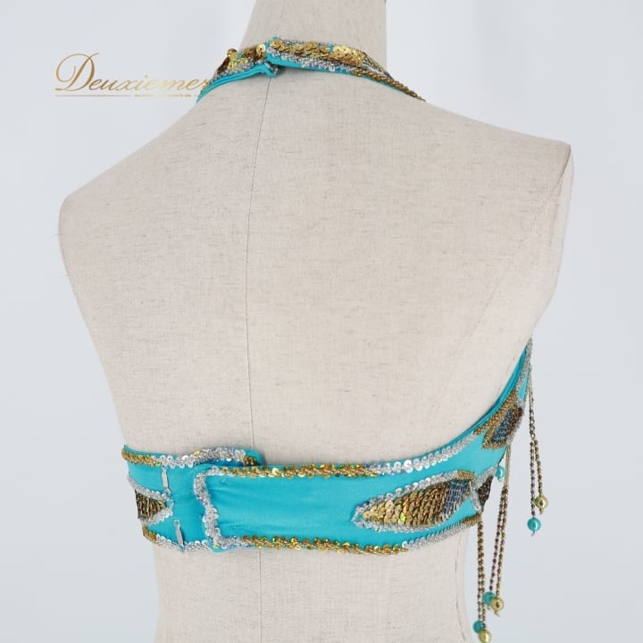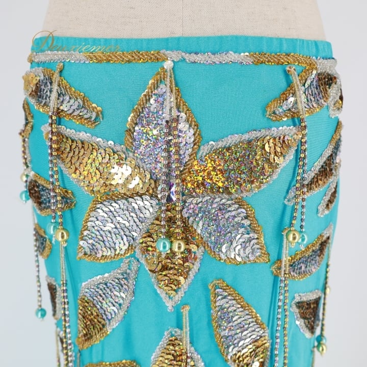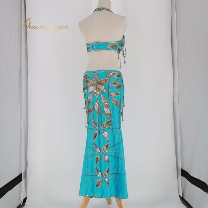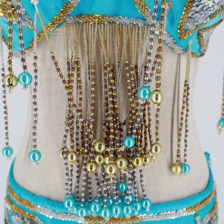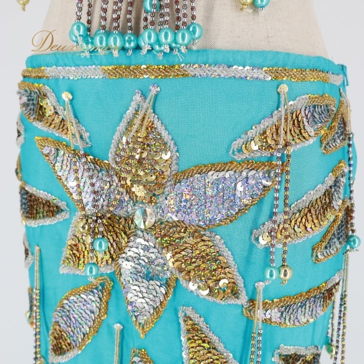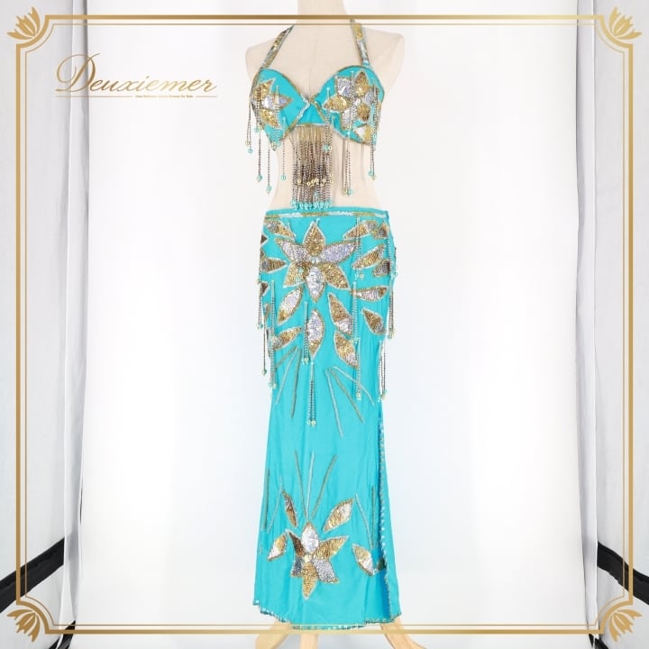 #ベリーダンス #オリエンタル衣装 #ダンスコスチューム #水色 #花モチーフ #ラインストーン #スパンコール #華やか #女性用トルソー #ダンスタイム #演技用衣装 #アラビアンダンス #コスプレ #パーティー用 #スカート #トップス #異文化体験 #ダンスウェア #スポーツファッション #ENUTSU
