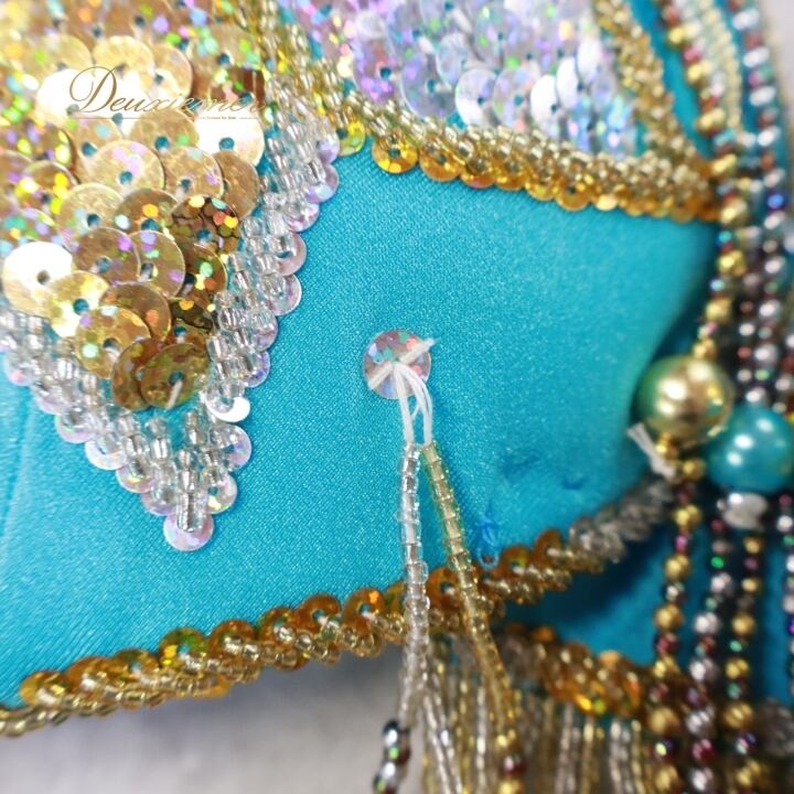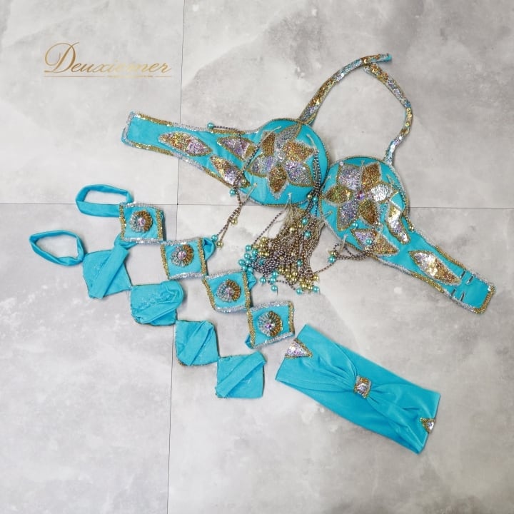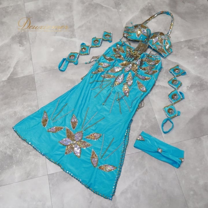 ベリーダンス オリエンタル 衣装 上下セット ブルー系 トップス スカート 水色 金 ラインストーン スパンコール フリンジ スリット キラキラ 花 アーム アーム飾り 腕飾り 頭飾り バンダナ ステージ イベント 華やか かわいい ゴールド系 シルバー系