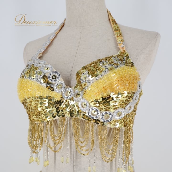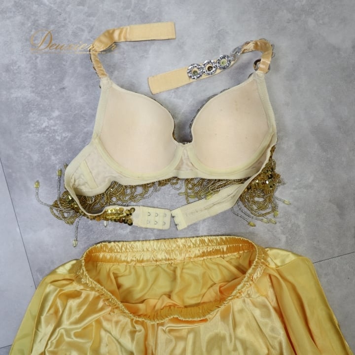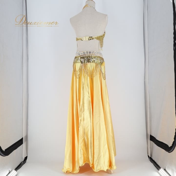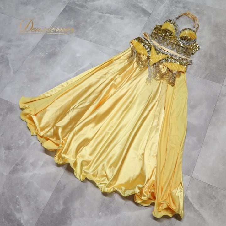 #ベリーダンス #オリエンタル衣装 #ダンスコスチューム #イエロー #スパンコール #ビーズ装飾 #ファッション #ダンス衣装 #女性用トルソー #衣装 #パーティー用 #華やか #エキゾチック #コスプレ #ステージ衣装 #アンダーストラップ #ウエストゴム #スリットスカート #ダンスパフォーマンス #ENUTSU