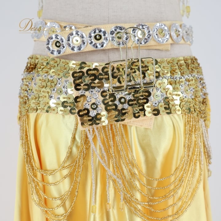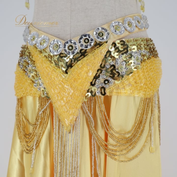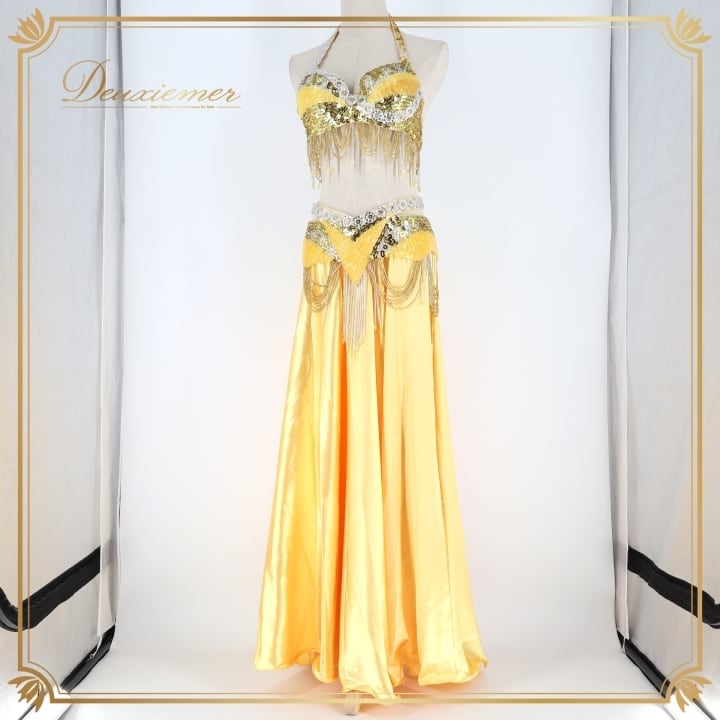 ベリーダンス オリエンタル 衣装 上下セット イエロー系 トップス スカート ベルト 黄 金 スパンコール フリンジ ビーズ 豪華 装飾 キラキラ 華やか スリット 明るい ダンス衣装 ステージ イベント かわいい ゴールド系 シルバー系