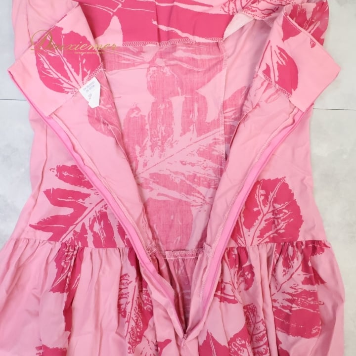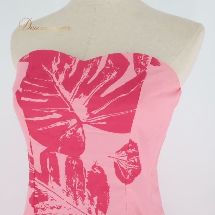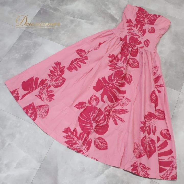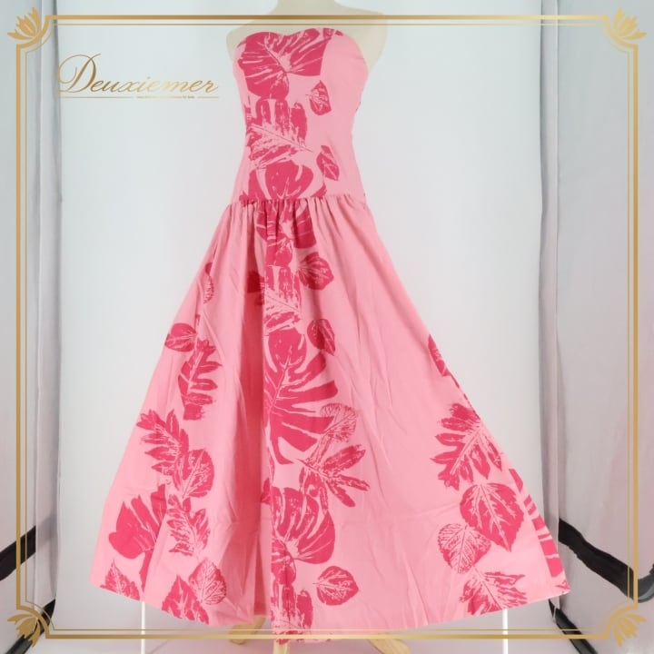 フラダンス 衣装 ワンピース ドレス ピンク系 ハワイ製 ワントーン チューブトップ モンステラ柄 かわいい 華やか 鮮やか 明るい ハワイアン アロハ ハワイアンプリント フラ ダンス レッスン 練習 ハワイアンファッション パーティー用ドレス おしゃれ