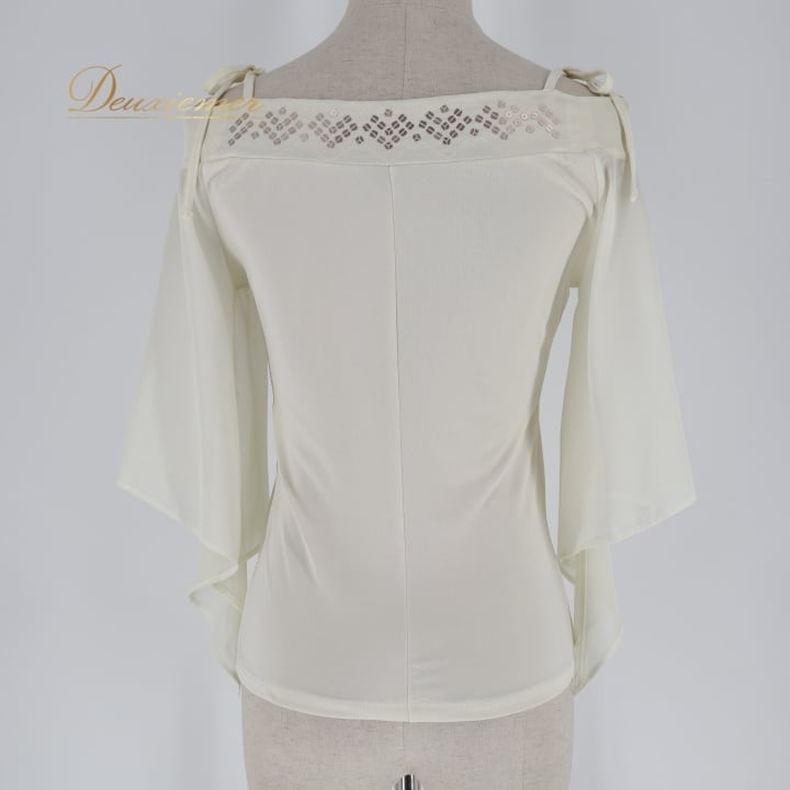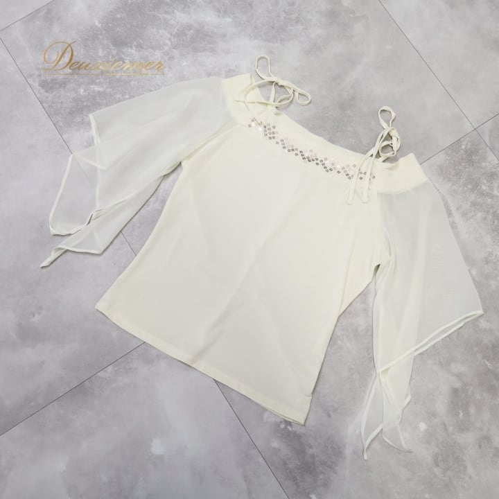 社交ダンス 衣装 トップス ブラウス ホワイト系 チャコット Chacott 白 日本製 スパンコール リボン 練習 レッスン 伸縮 ストレッチ シンプル ダンス衣装 イベント パーティー 上品 かわいい 爽やか 明るい