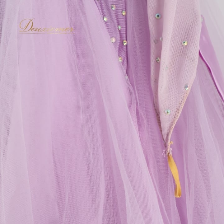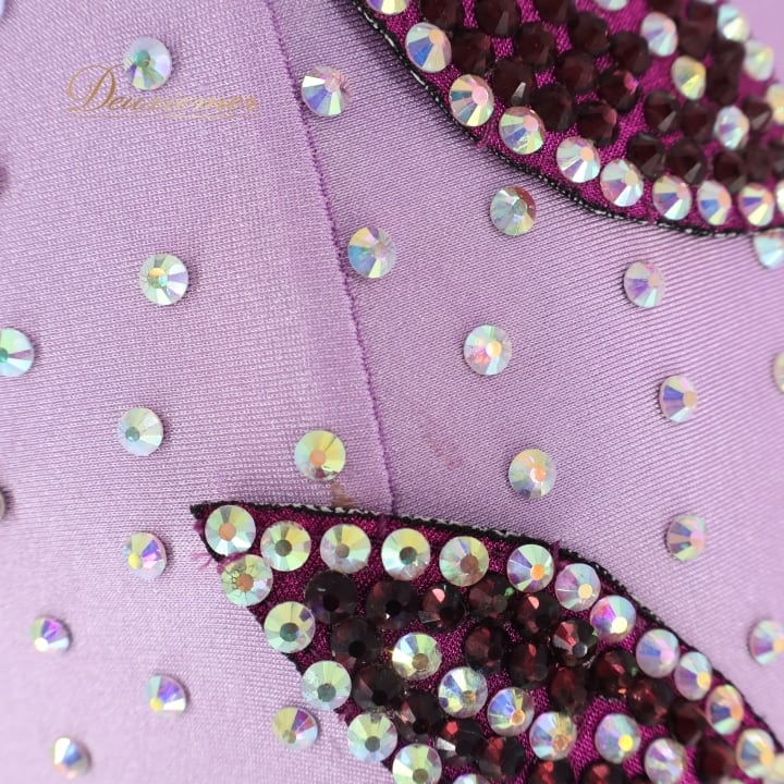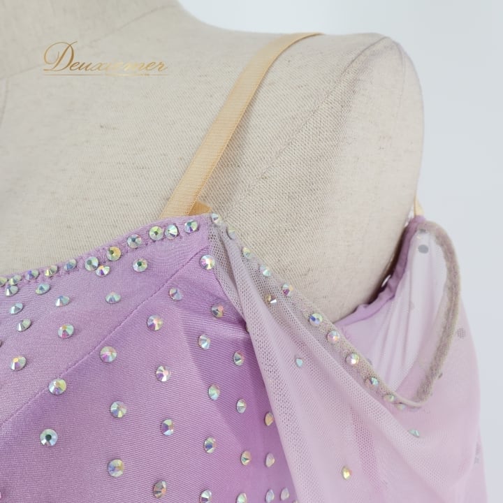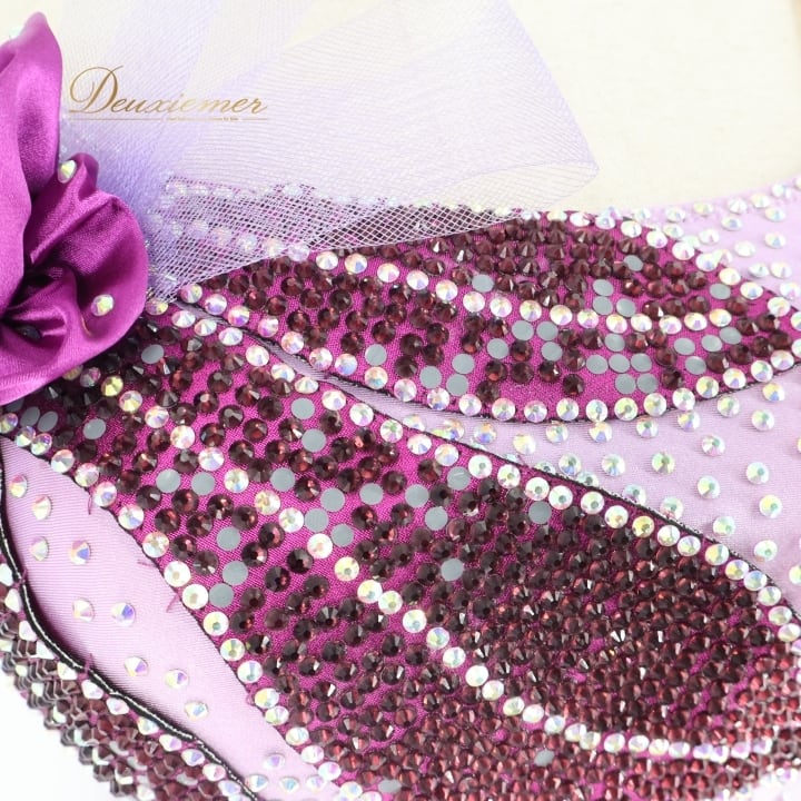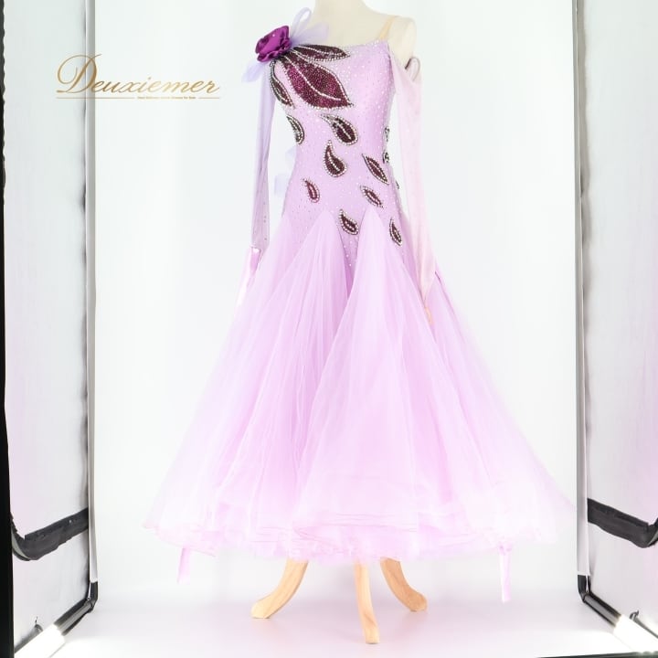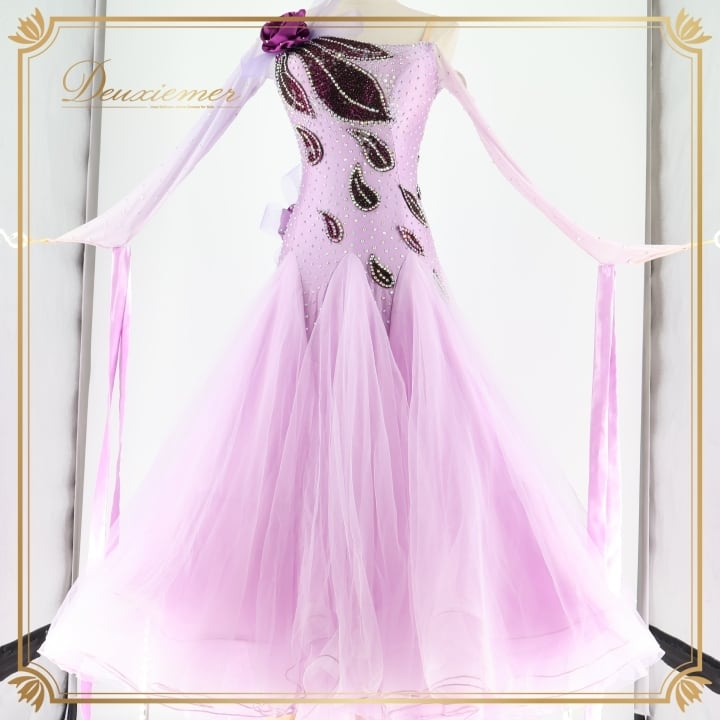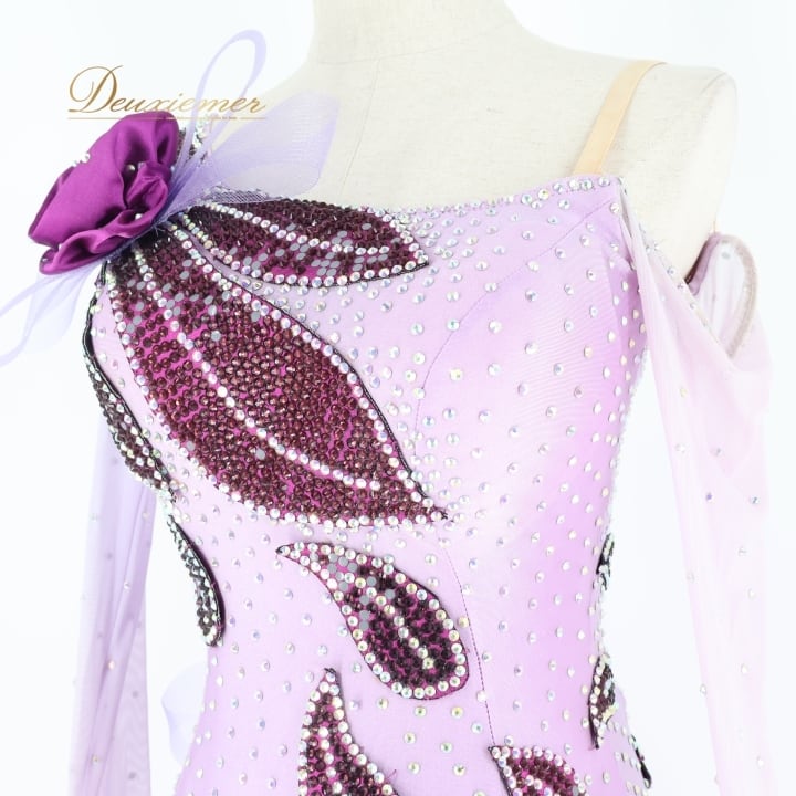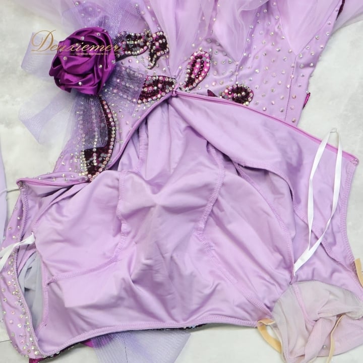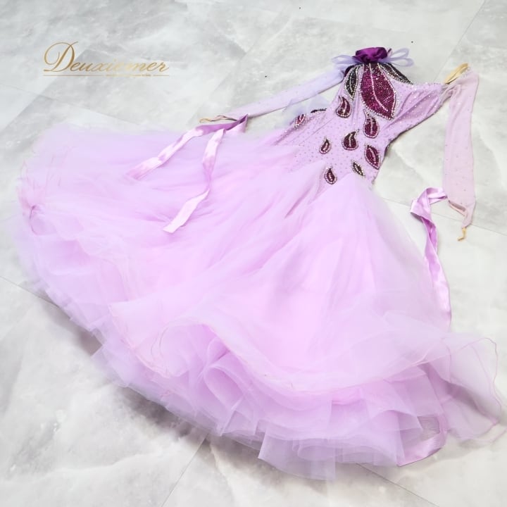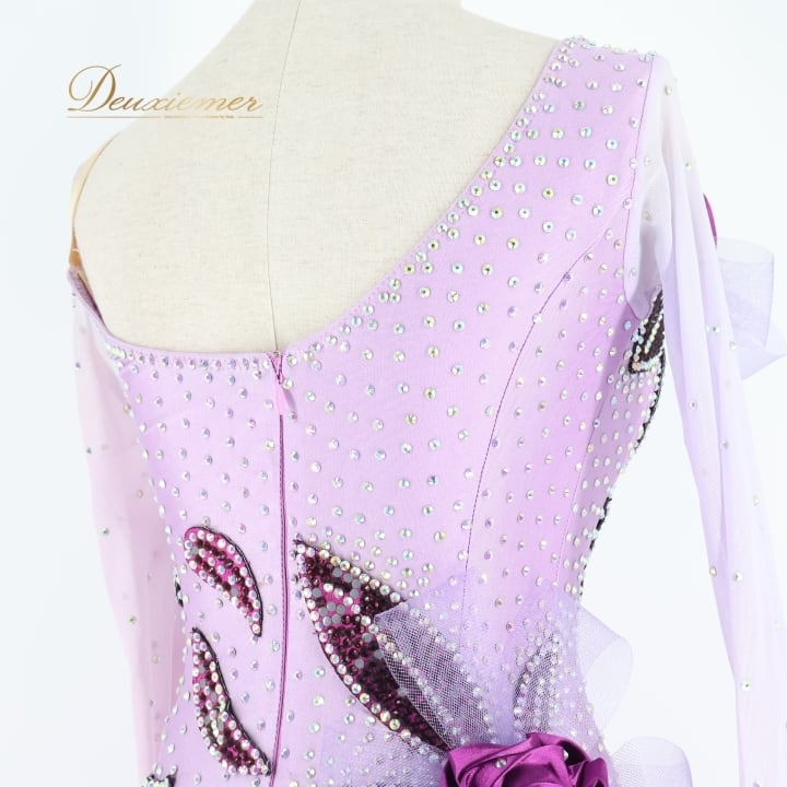 社交ダンス 衣装 スタンダードドレス ワンピース ドレス スタンダード 紫 ラベンダー デモ 競技 ダンス パーティ 発表会 フリル レース 薔薇 パープル系 キラキラ 輝き おしゃれ 華やか ダンス服 フェミニン イベント用 競技用装飾