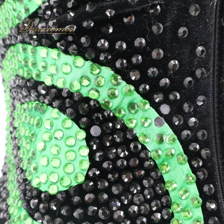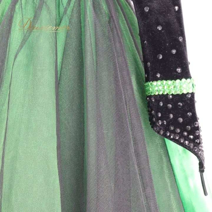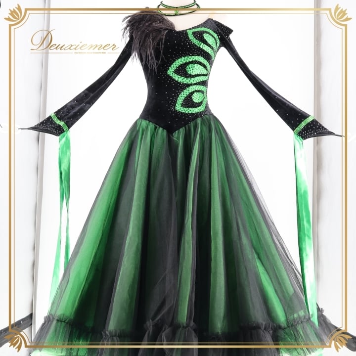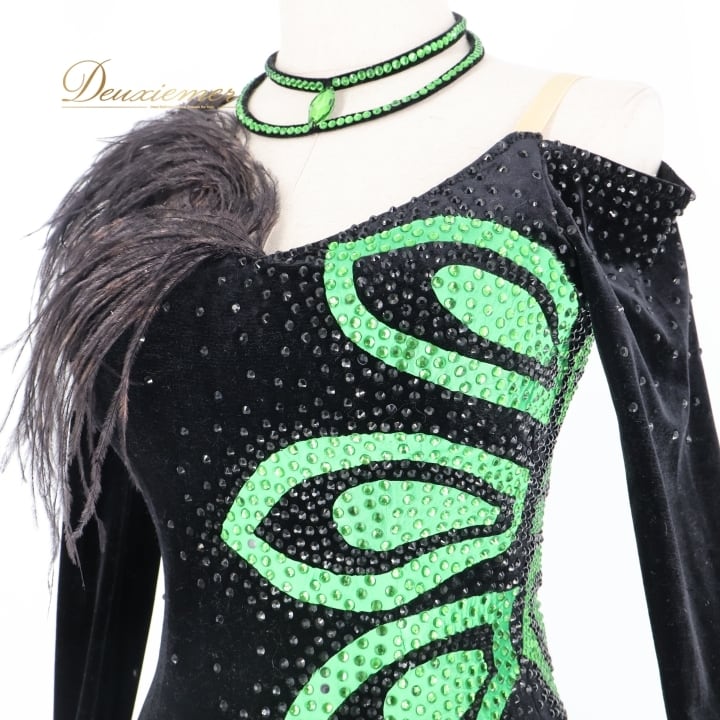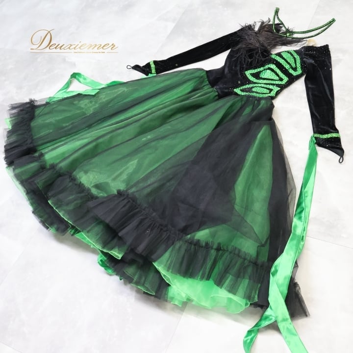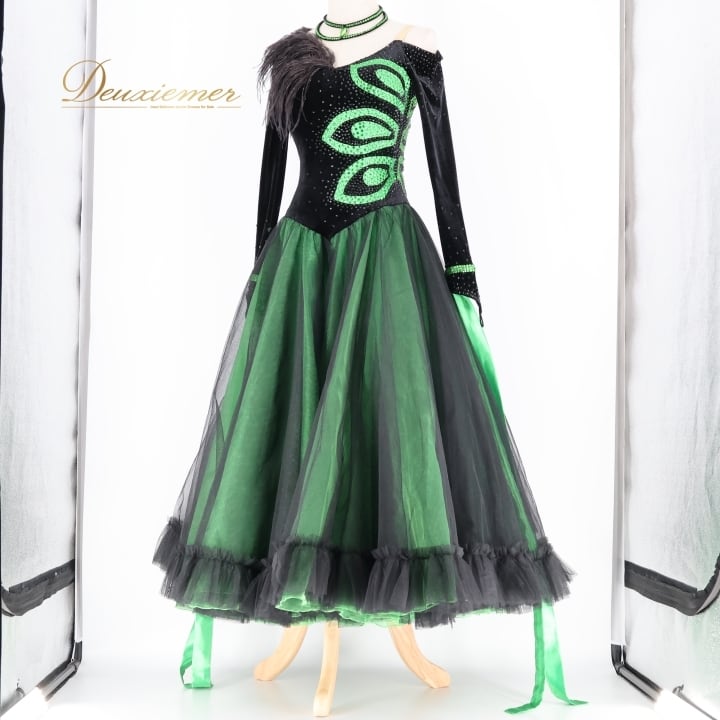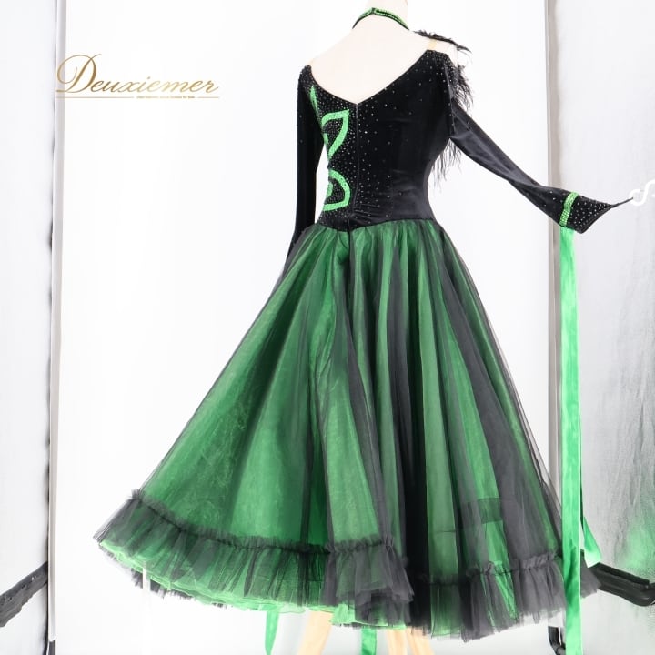 社交ダンス 衣装 スタンダードドレス ワンピース ドレス スタンダード 黒 緑 ベロア フリル レース デモ 競技 ダンス パーティ 発表会 上品 羽 高級感 ブラック系 グリーン系 ゴージャス スカート チュール おしゃれ 上品 高級衣装 ショー 衣装 美しい 華やか 大人用