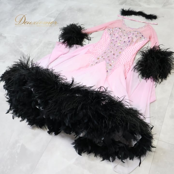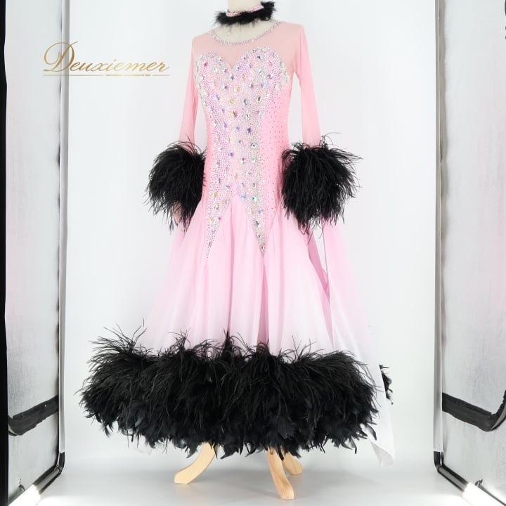 社交ダンス 衣装 スタンダードドレス ワンピース ドレス 黒 ピンク ファー フェザー デモ 競技 ダンス パーティ 発表会 かわいい ゴージャス 明るい 大きめ ブラック系 ピンク系 エレガント 競技用 ダンスパフォーマンス 上品