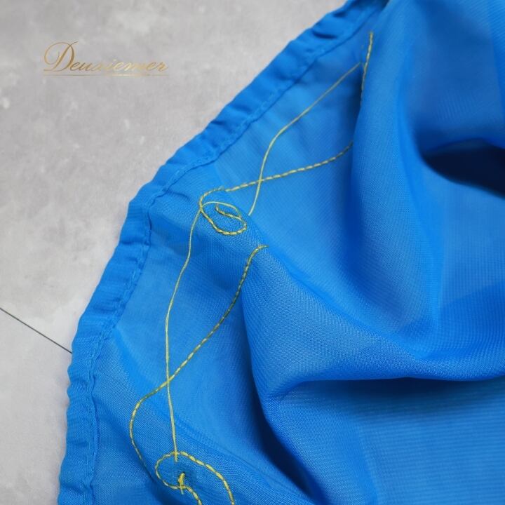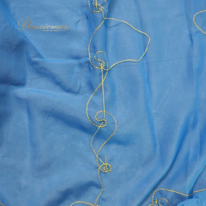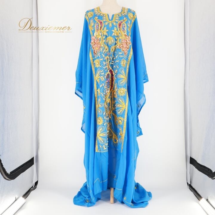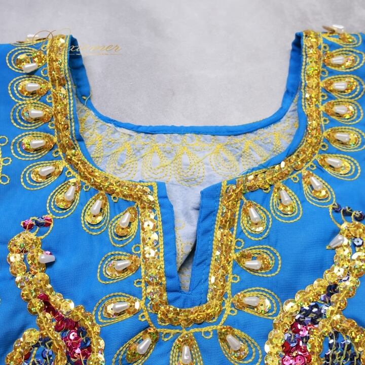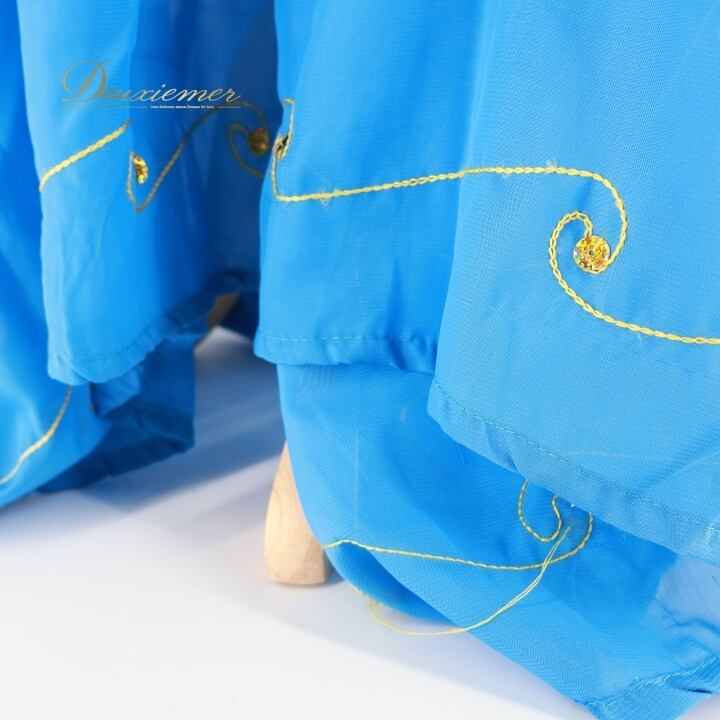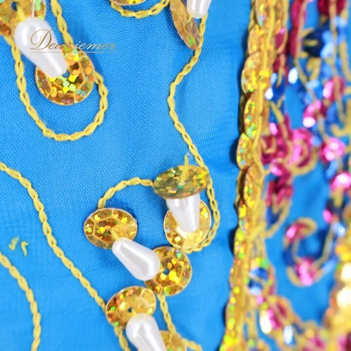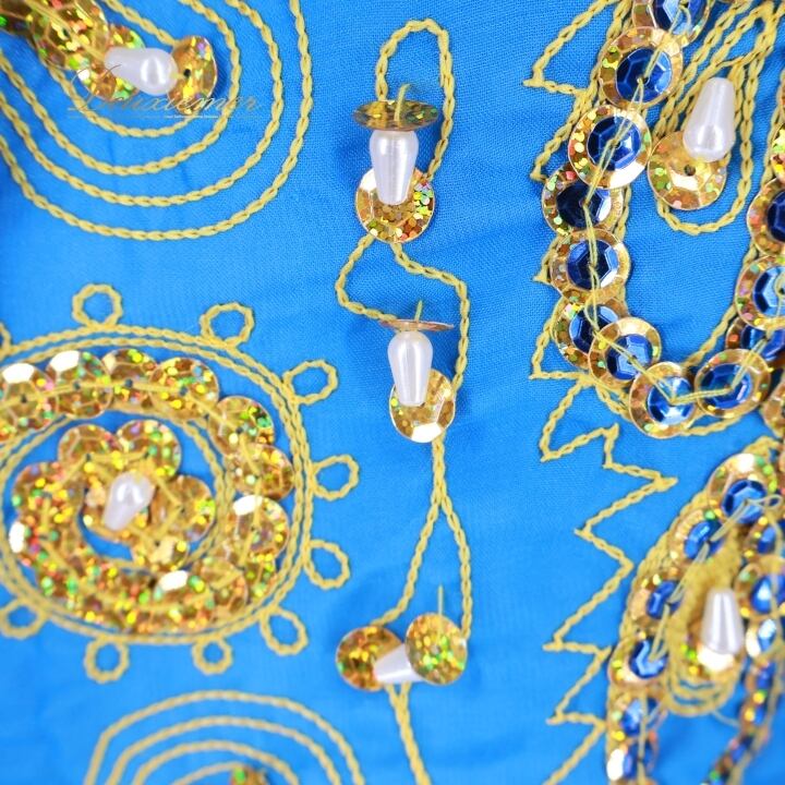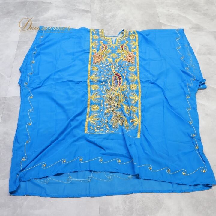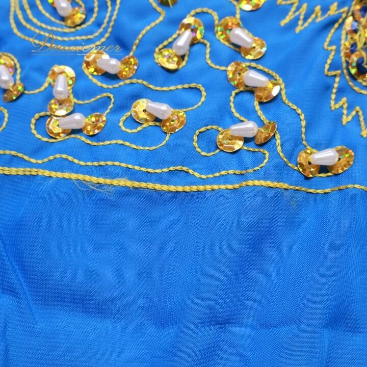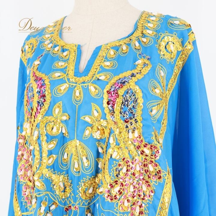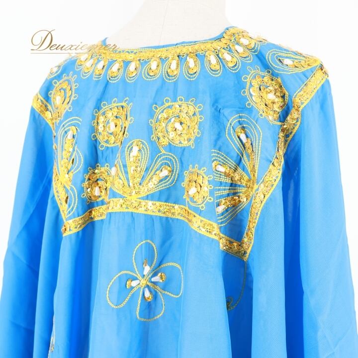 ベリーダンス 衣装 ハリージドレス ブルー系 スパンコール ビーズ 水色 青 黄 金 ガラベーヤ ワンピース ドレス 爽やか 羽織り 民族舞踏 ダンス衣装 刺繍 ステージ衣装 華やか 鮮やか 豪華 装飾 明るい 透け感 ゴールド系 イエロー系