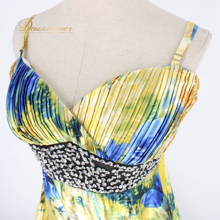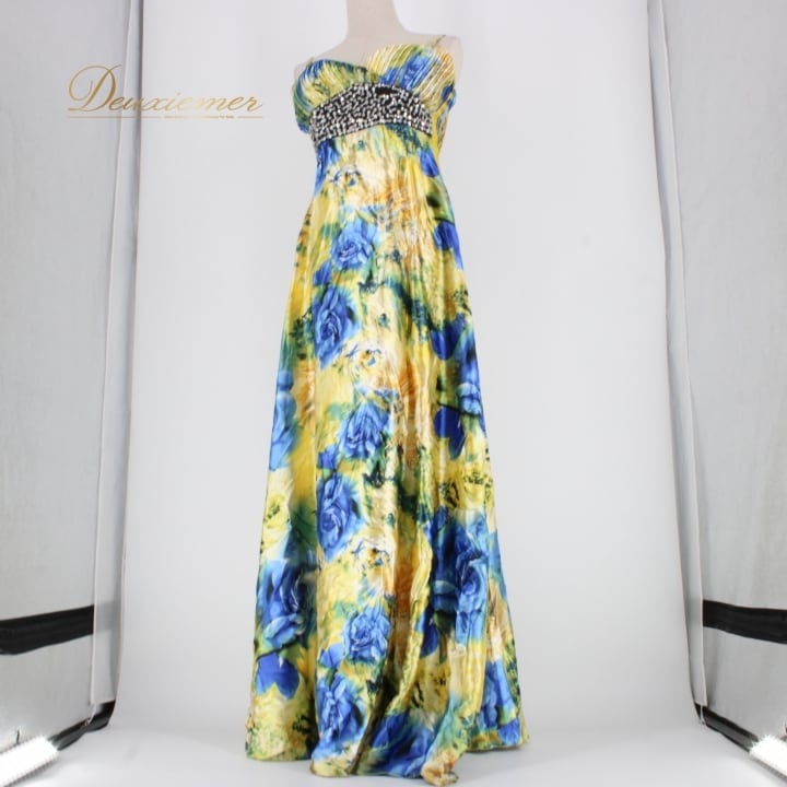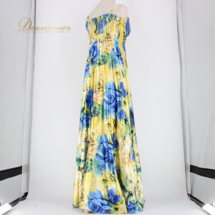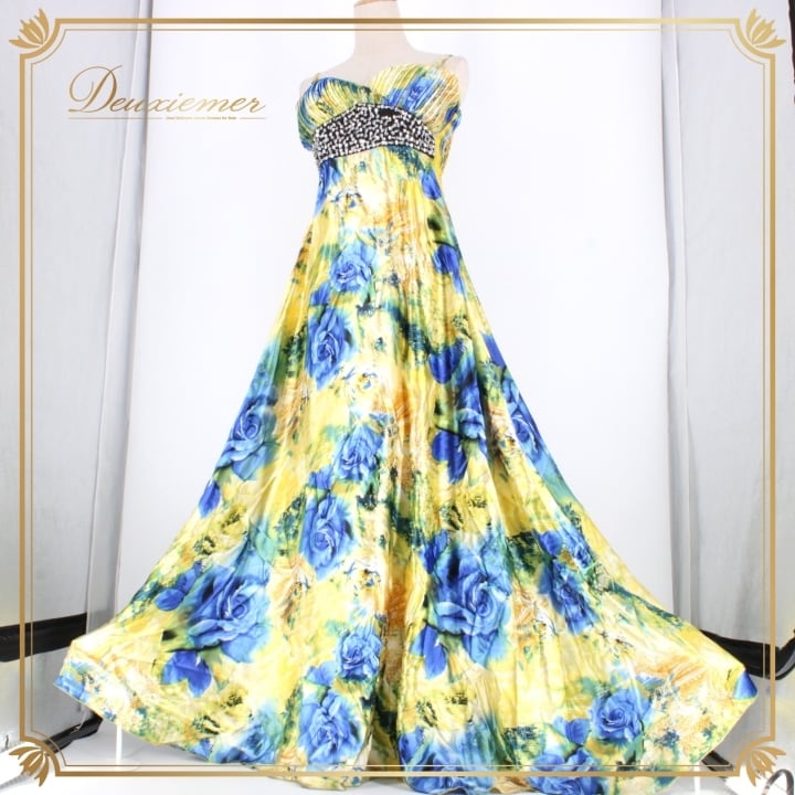 パーティドレス ロングドレス キャバドレス ナイトドレス ステージ衣装 dazzy queen クラブ カラオケ 発表会 演奏会 社交ダンス 青 黄色 ブルー系 イエロー系 花柄 薔薇 バラ ロング丈 膝丈 レディース おしゃれ フォーマル 伸縮性あり デザインドレス フラワープリント 花模様 目を引く お出かけ 特別な日 サイズフリー 着回し クリスマス 結婚式 パーティ 祝賀会
