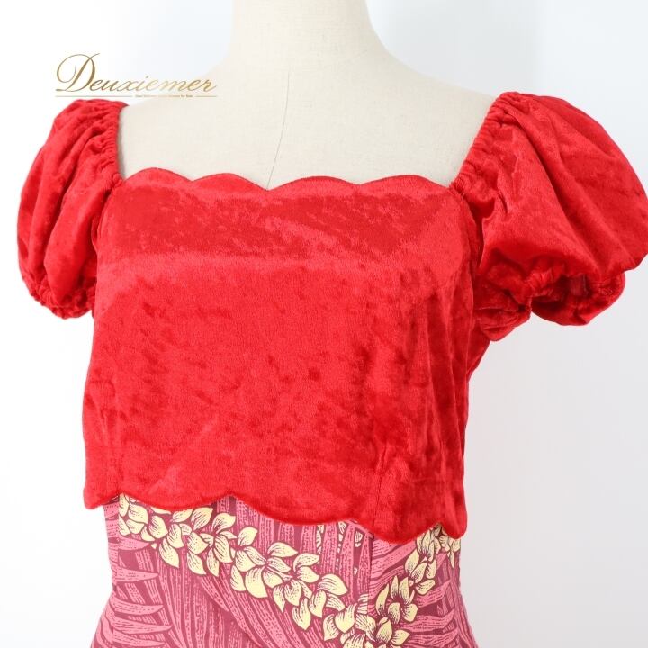 フラダンス 衣装 ワンピース ドレス レッド系 アロハスタンダード 日本製 ハワイアンプリント ALOHA STANDARDS アロハ フラ ダンス レッスン 練習 ベロア 半袖 パフスリーブ フリル 華やか 鮮やか かわいい おしゃれ 上品 高級感 ベージュ系 イエロー系 赤 黄 レッド アロハ柄 ハワイアン 女性用 かわいいデザイン おしゃれなスタイル フリル付き