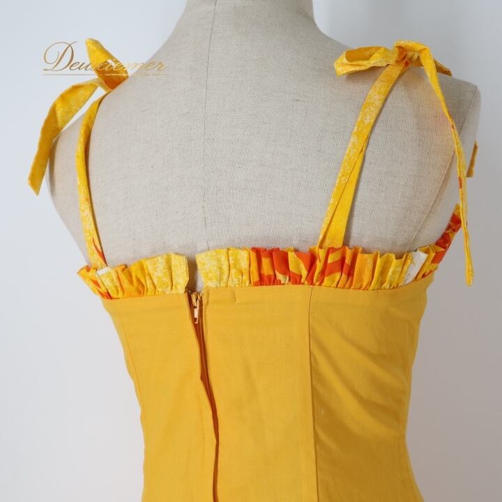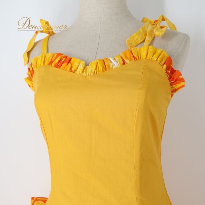 フラダンス 衣装 ワンピース ドレス イエロー系 トーチジンジャー ハワイ製 ティアレ柄 ハワイアンプリント TorchGinger アロハ フラ ダンス レッスン 練習 フリル キャミソール リボン 華やか 鮮やか かわいい おしゃれ オレンジ系 ホワイト系 黄 橙 白 フラ ダンス衣装 ハワイアン ドレッシー レッスン着 レディース