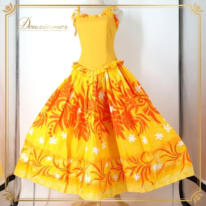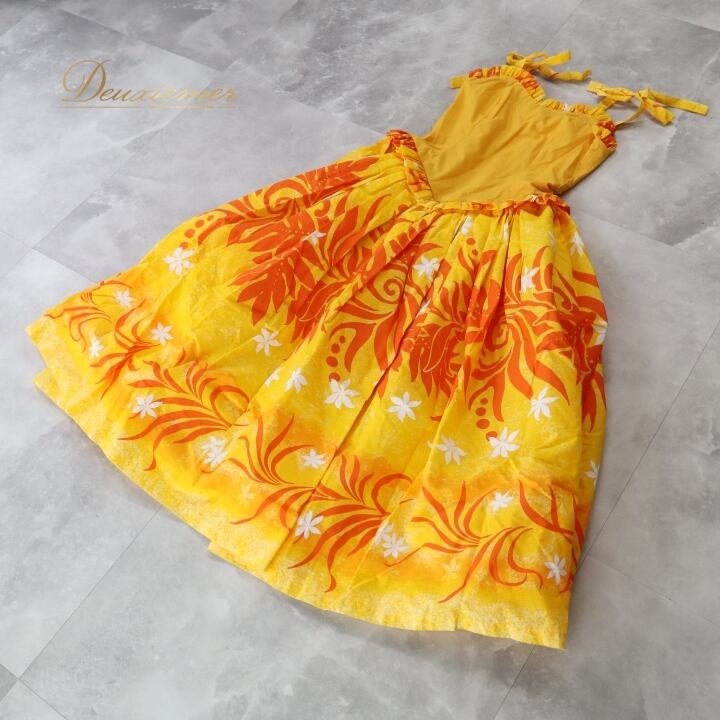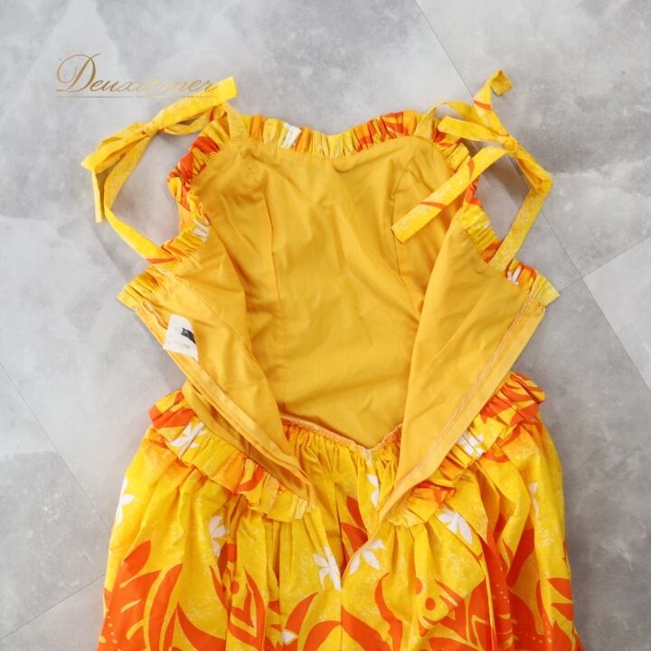 #フラダンス #フラダンス衣装 #ワンピース #ドレス #ハワイ製 #TorchGinger #カラフル #カラフルドレス #イエロー #オレンジ #ホワイト #肩紐リボン #サイズ7号 #トルソー #ファッション #ダンス衣装 #パーティードレス #ビーチウェア #夏服 #ENUTSU