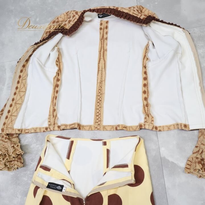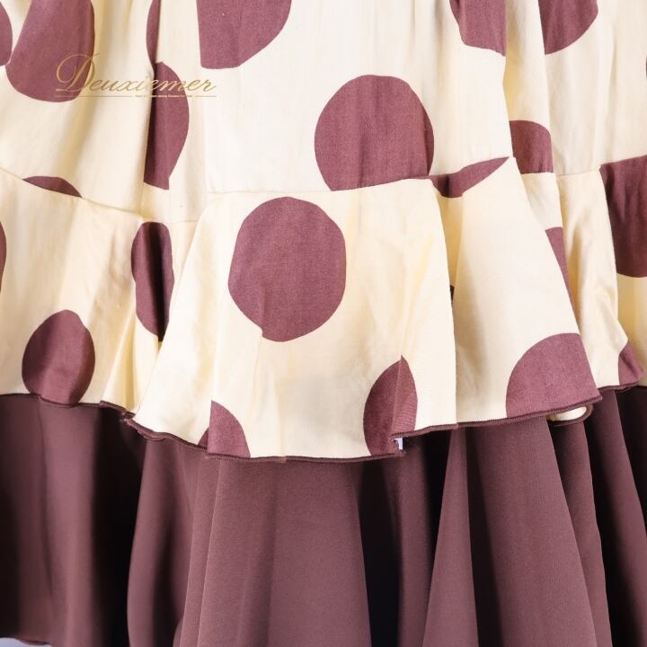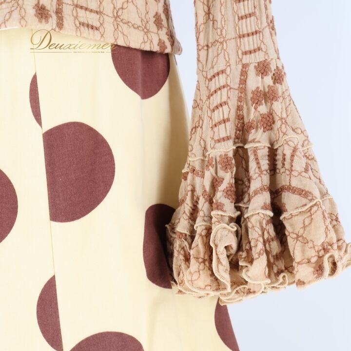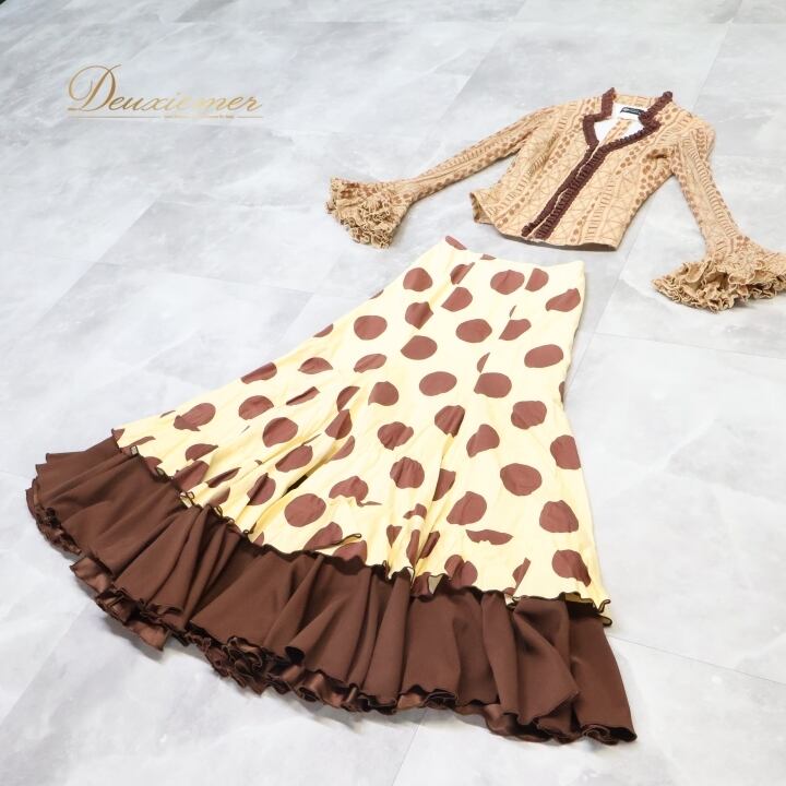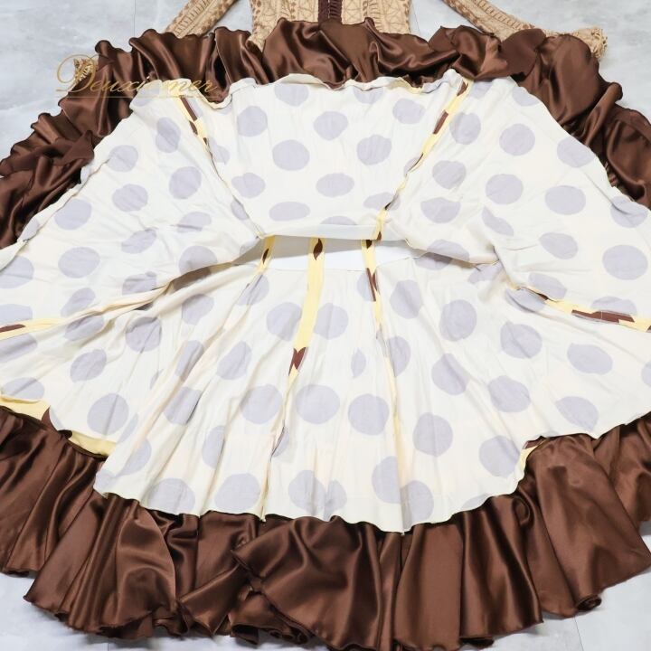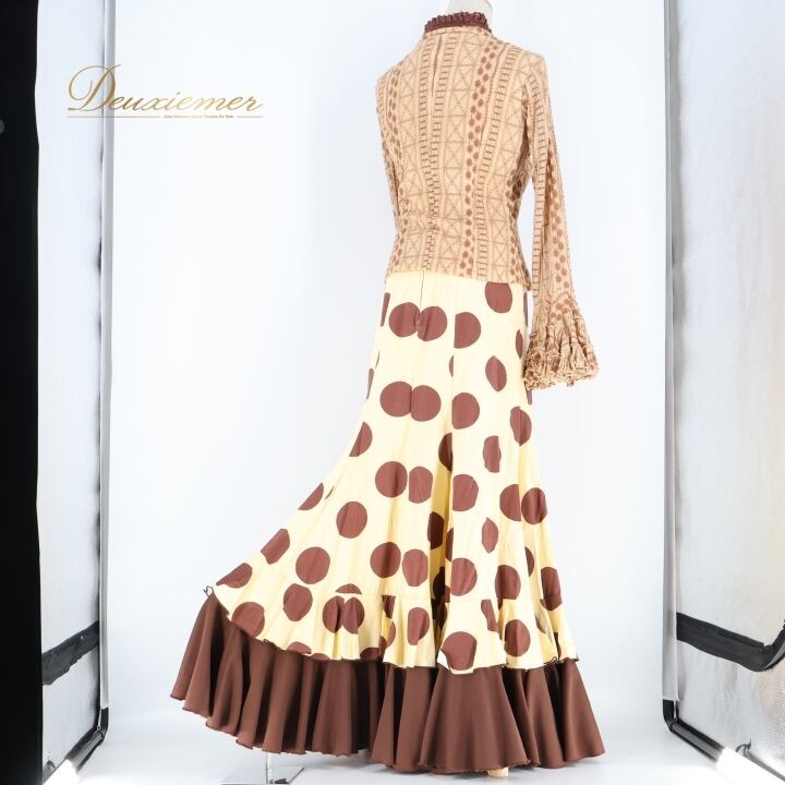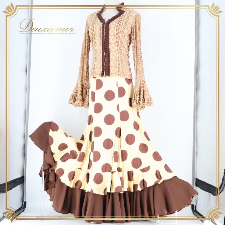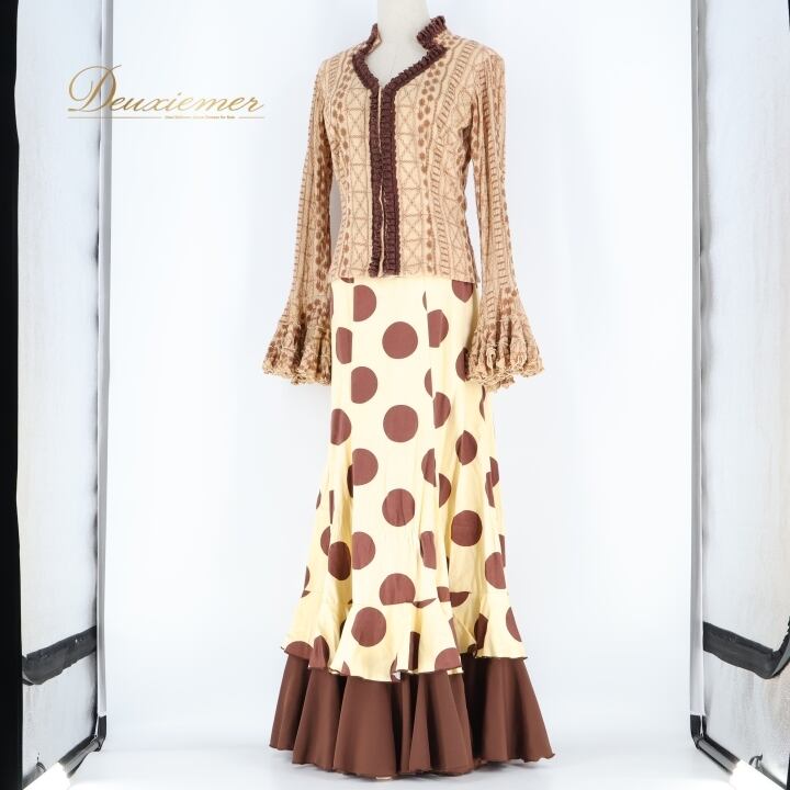フラメンコ 衣装 ソニアジョーンズ SONIA JOHNES トップス ブラウス ファルダ スカート ツーピース セットアップ 水玉 ドット フリル 刺繍 イエローベージュ ベージュ系 ブラウン系 フラメンコ衣装 おしゃれ 可愛い おすすめ パーティ 大人 舞台衣装 ステージ衣装 長袖