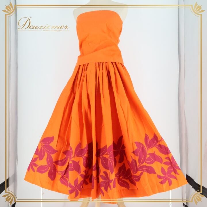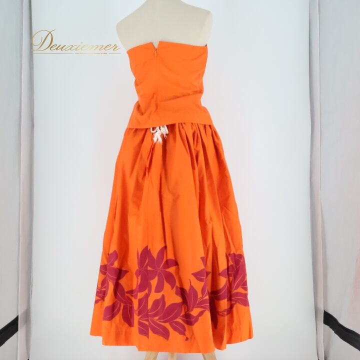 #フラダンス #フラダンス衣装 #ツーピース #女性用衣装 #オレンジ衣装 #華やか #チューブトップ #ダンス衣装 #スカートセット #おしゃれ #ファッション #季節限定 #鮮やか #トルソー #ウエスト紐 #ポリエステル #綿 #ダンスイベント #衣装セット #ENUTSU