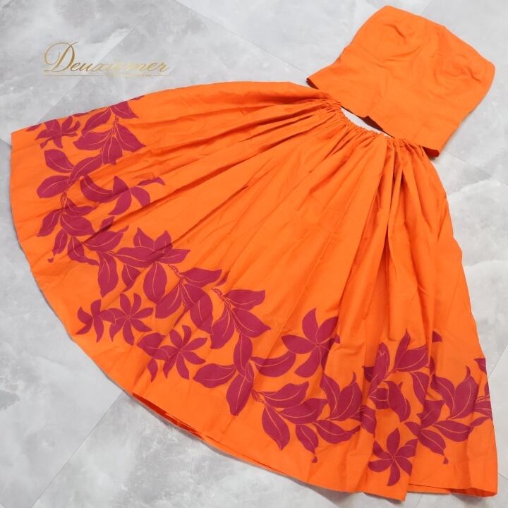 フラダンス 衣装 ツーピース セットアップ 上下セット オレンジ系 チューブトップ ワントーン ティアレ柄 かわいい 華やか 鮮やか 明るい 橙 ハワイアン アロハ ハワイアンプリント フラ ダンス レッスン 練習 おしゃれ ダンス衣装 イベント 目を引く