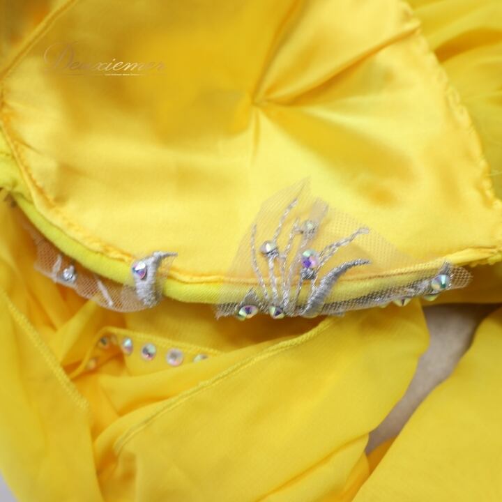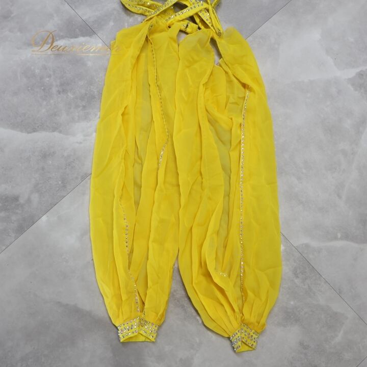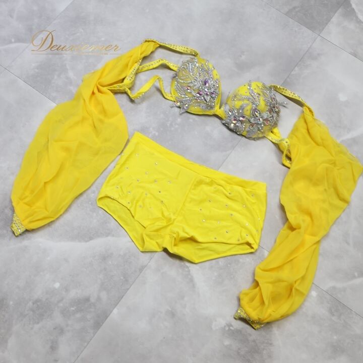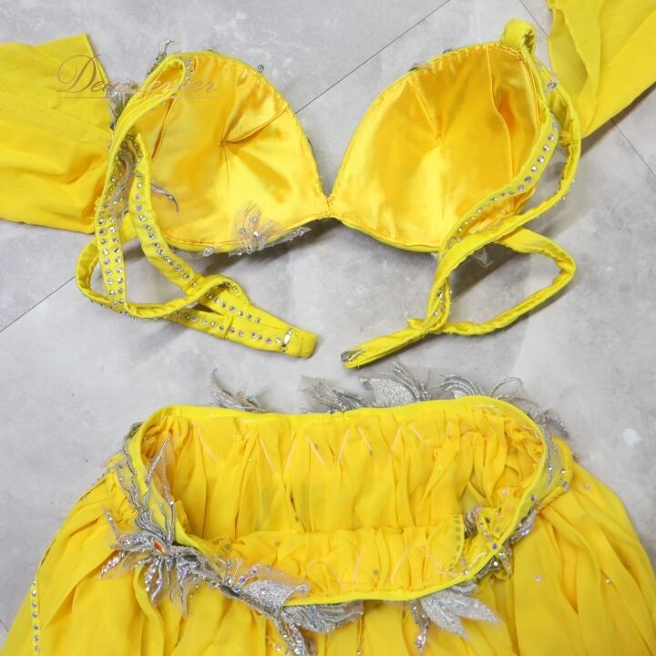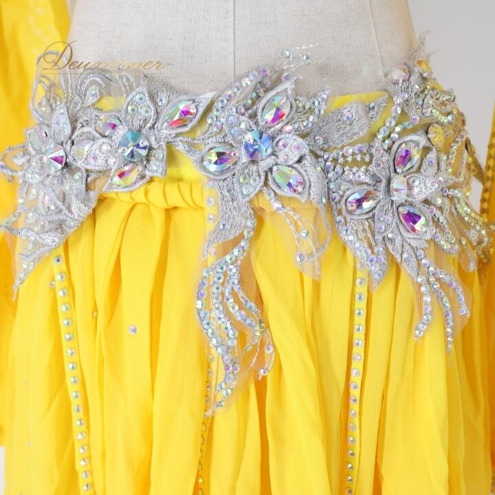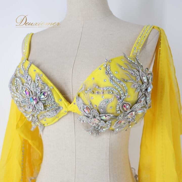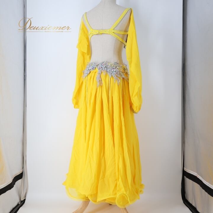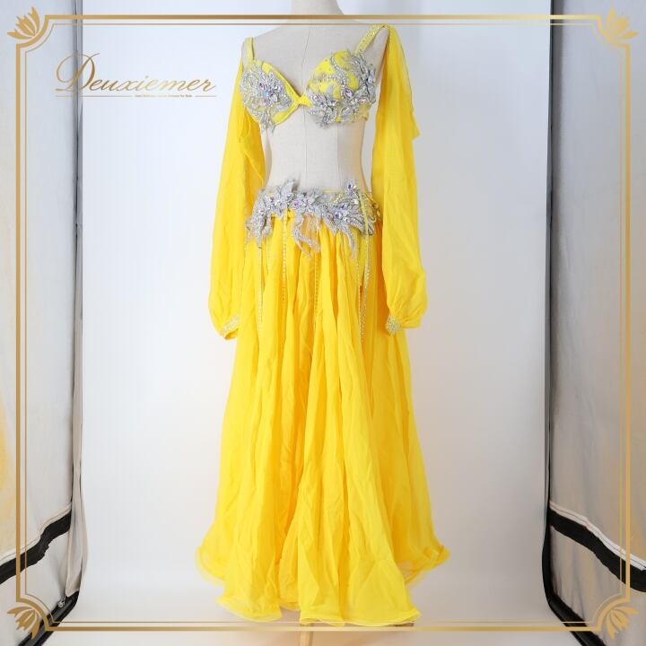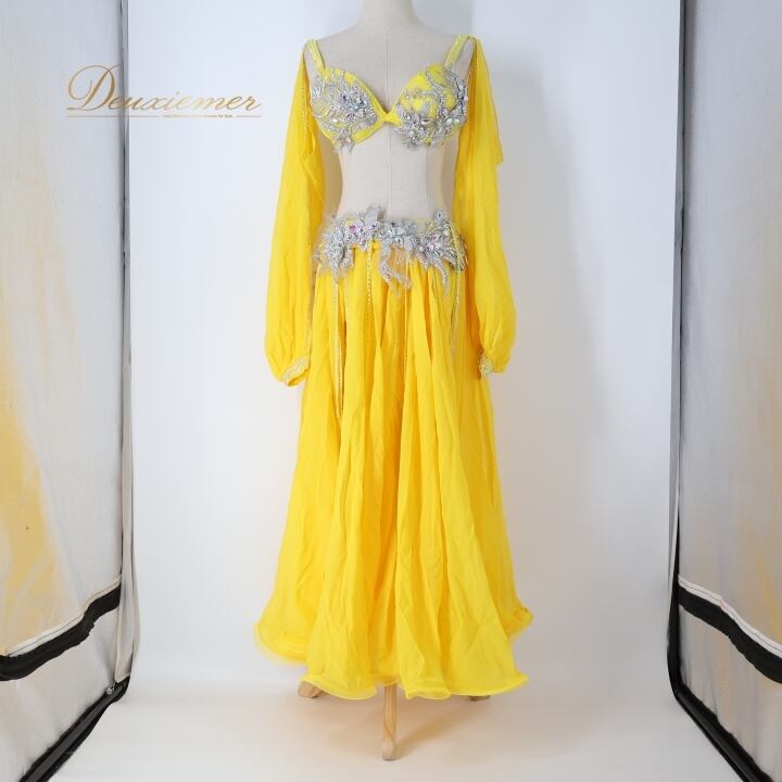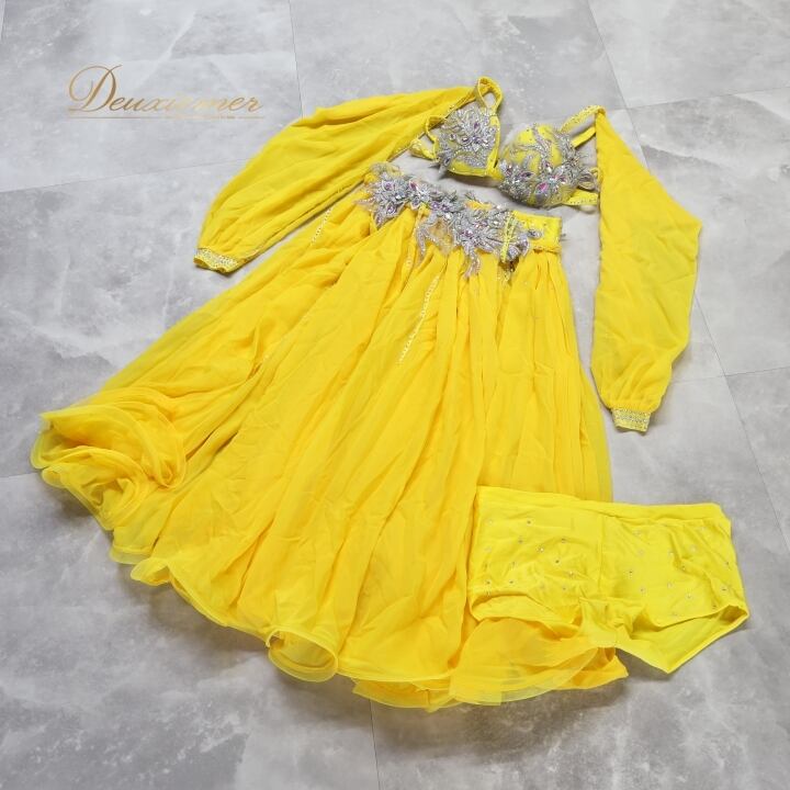 ベリーダンス オリエンタル 衣装 上下セット イエロー系 トップス スカート インナーパンツ 黄 ラインストーン 花 キラキラ 豪華 装飾 鮮やか 明るい ダンス衣装 イベント ステージ 華やか シルバー系