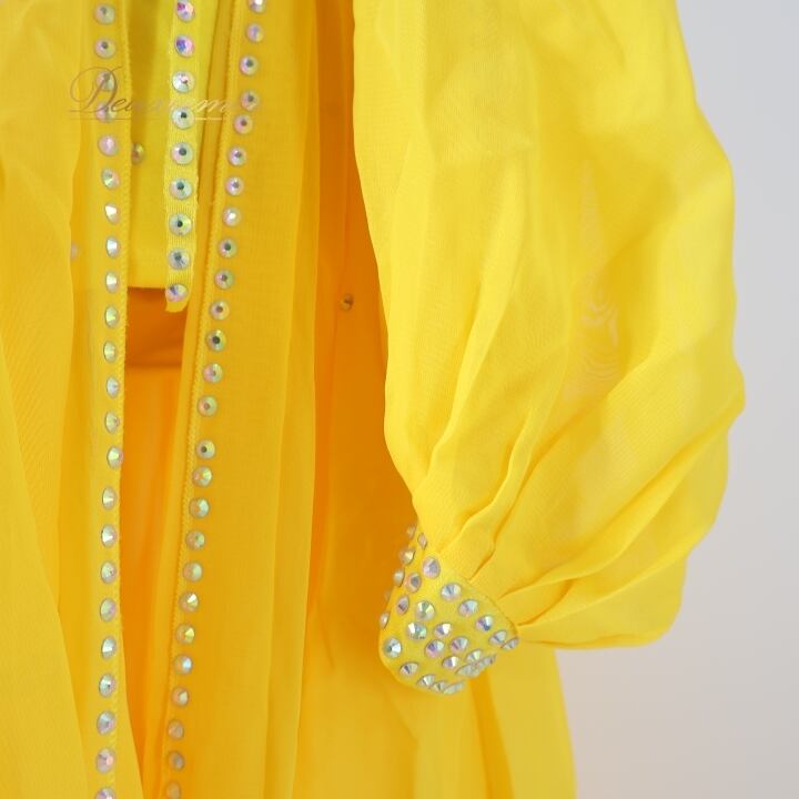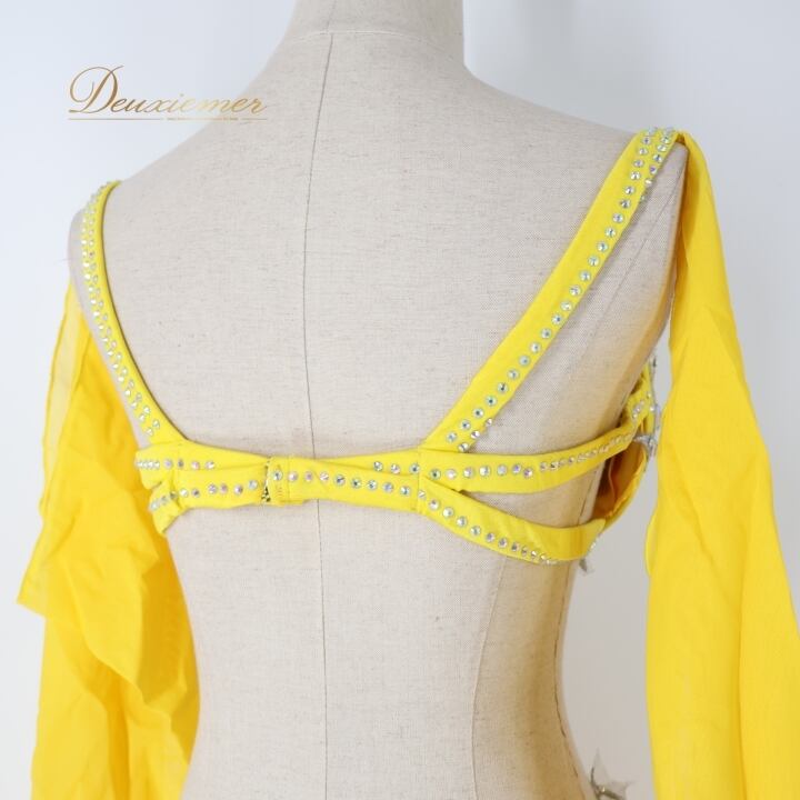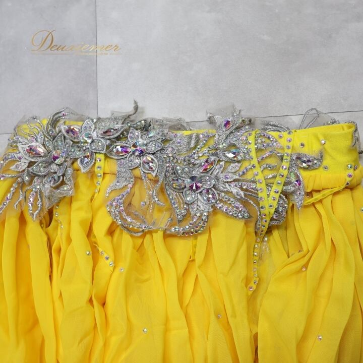 #ベリーダンス #オリエンタル衣装 #ダンス衣装 #カラフル #イエロー #花モチーフ #ラインストーン #スリットスカート #ウエストゴム #華やか #パフォーマンス #舞台衣装 #女性用トルソー #ダンススタイル #大人可愛い #ストレッチ #ダンスファッション #ベリーダンサー #楽しい時間 #ENUTSU