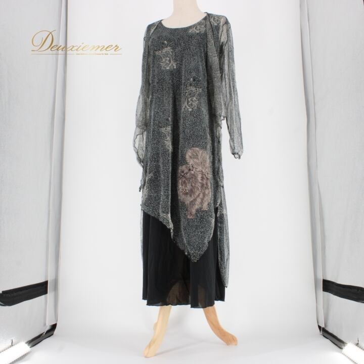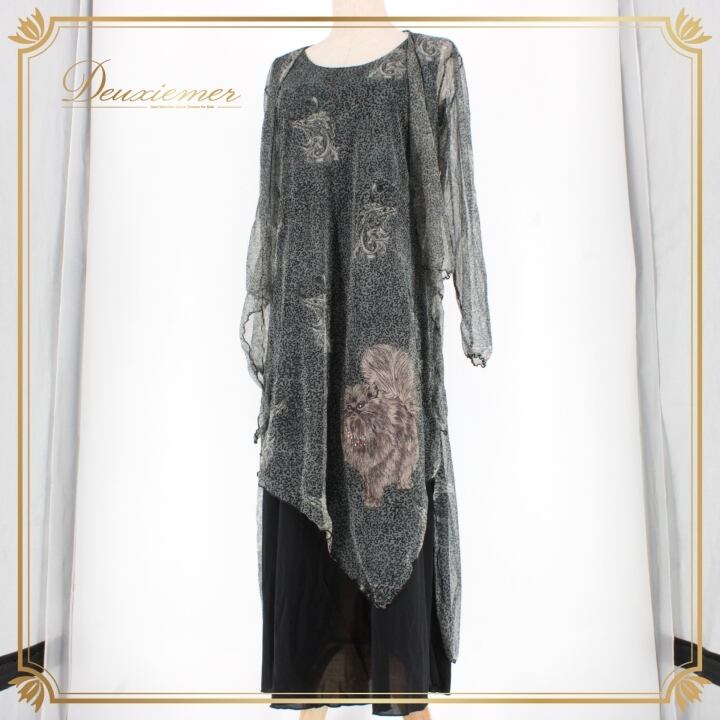 社交ダンス 衣装 スタンダード ドレス ワンピース レッスンウェア パーティドレス atelier eiko アトリエエイコ ブラック系 グレイ系 黒 ラインストーン 猫柄 おしゃれ エレガント フォーマル パーティー用 ステージ衣装 ダンスウェア ファッション フィット感 通気性 チュニック オーバーサイズ シースルー デザイン感 上品 レディース ストレッチ性 柔らかい 洗濯可