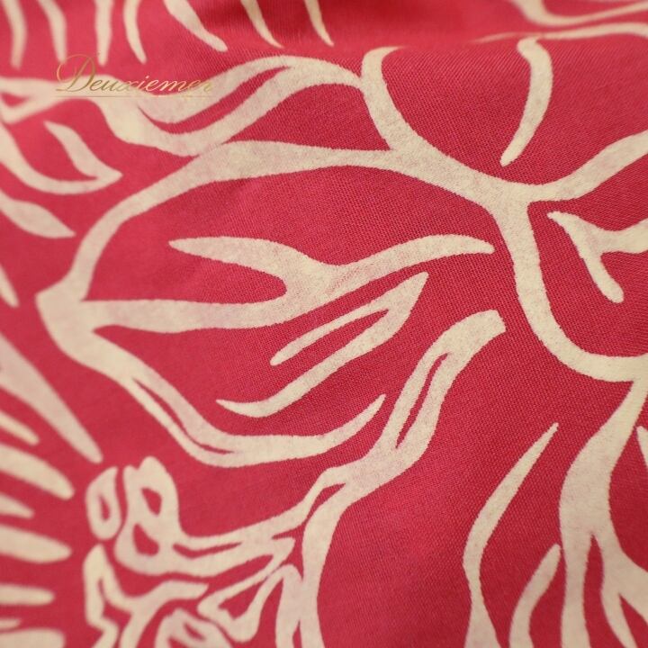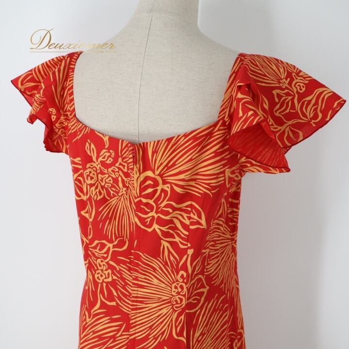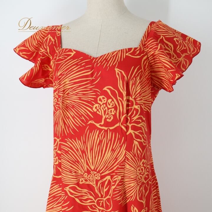 フラダンス 衣装 ワンピース ドレス レッド系 アロハスタンダード 日本製 ハワイアンプリント ALOHA STANDARDS アロハ フラ ダンス レッスン 練習 花柄 植物柄 イエロー系 赤 黄 フリル 華やか 鮮やか かわいい おしゃれ 上品 フリル袖 女性用 アロハシャツ