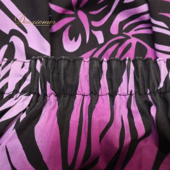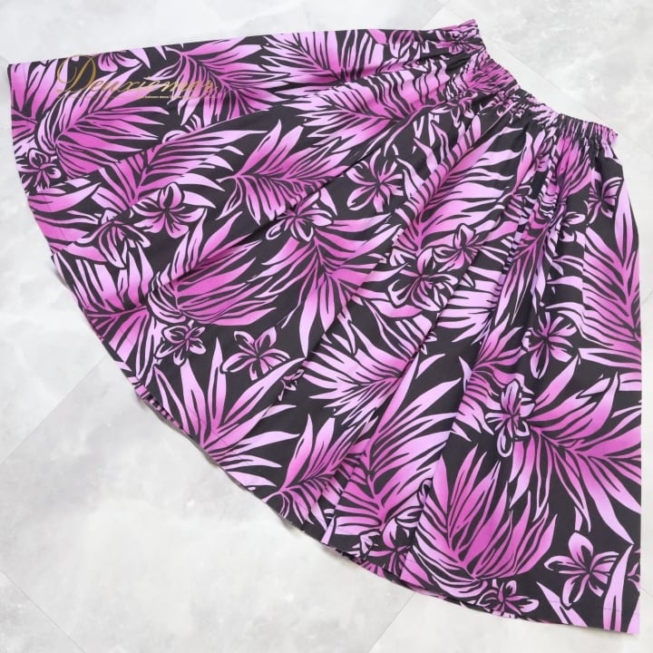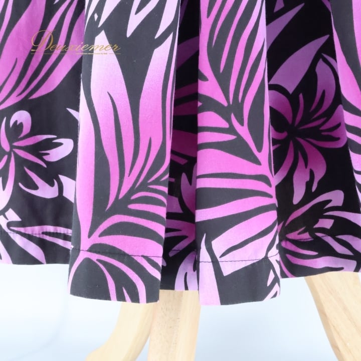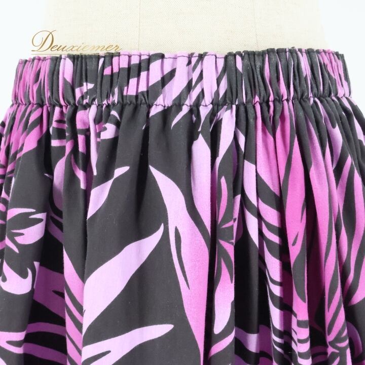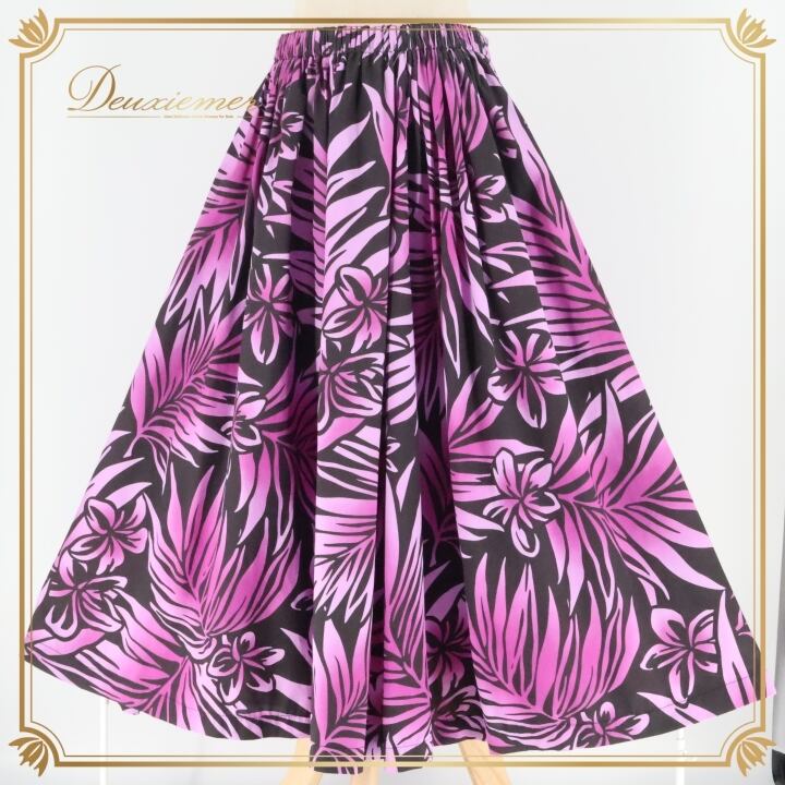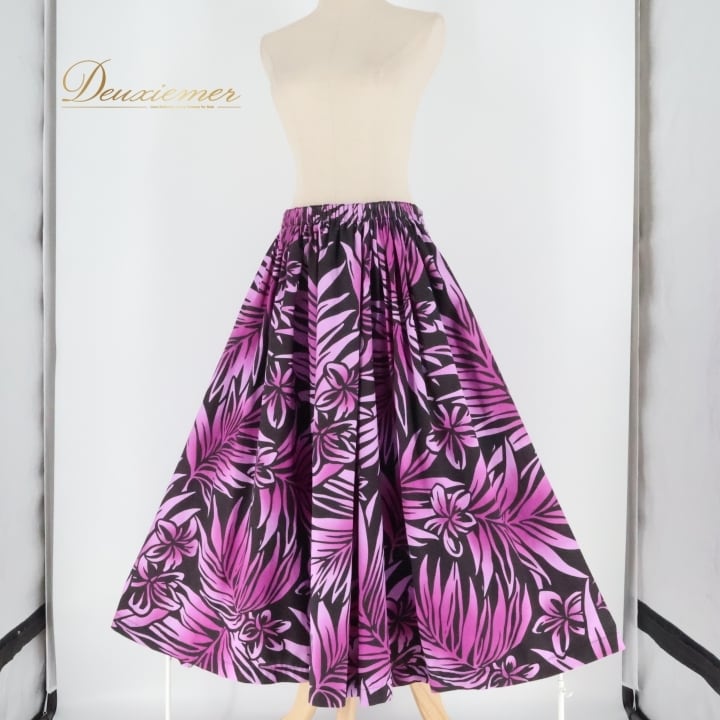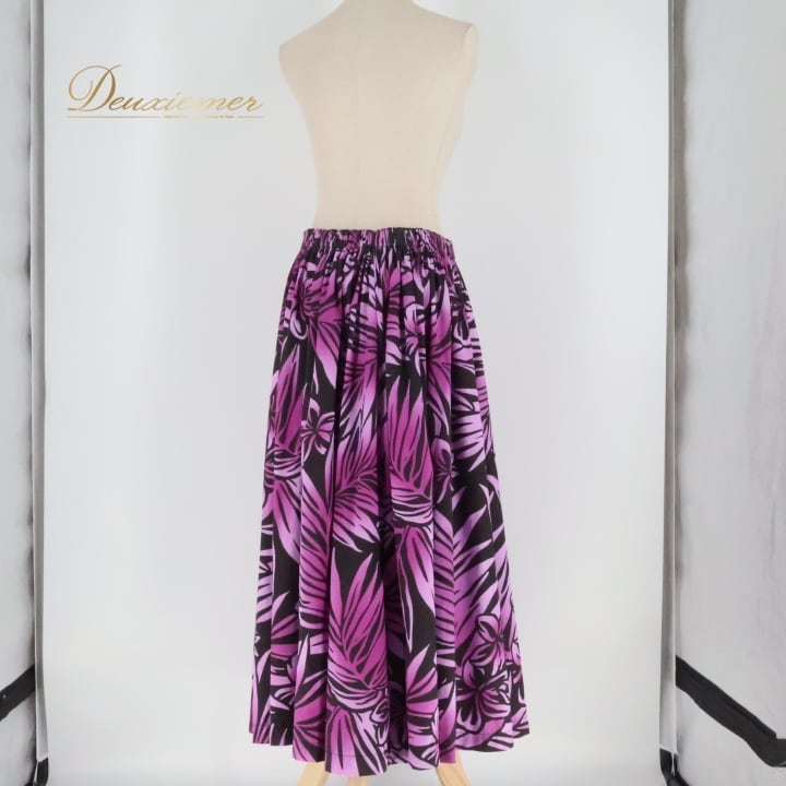 フラダンス 衣装 スカート ブラック系 パープル系 ツーカラー プルメリア柄 ラウアエ柄 シングル かわいい 華やか 鮮やか 上品 きれい 大人っぽい エレガント シンプル ハワイアン アロハ ハワイアンプリント フラ ダンス レッスン 練習 レディース