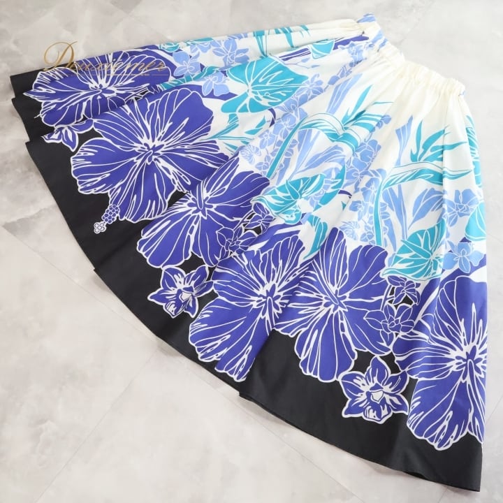 フラダンス 衣装 スカート アビバーレ ブルー系 Avivare ハイビスカス柄 シングル シンプル かわいい 華やか 鮮やか 明るい 爽やか きれい 青 白 黒 ハワイアン アロハ ハワイアンプリント フラ ダンス レッスン 練習 おしゃれ パーティー