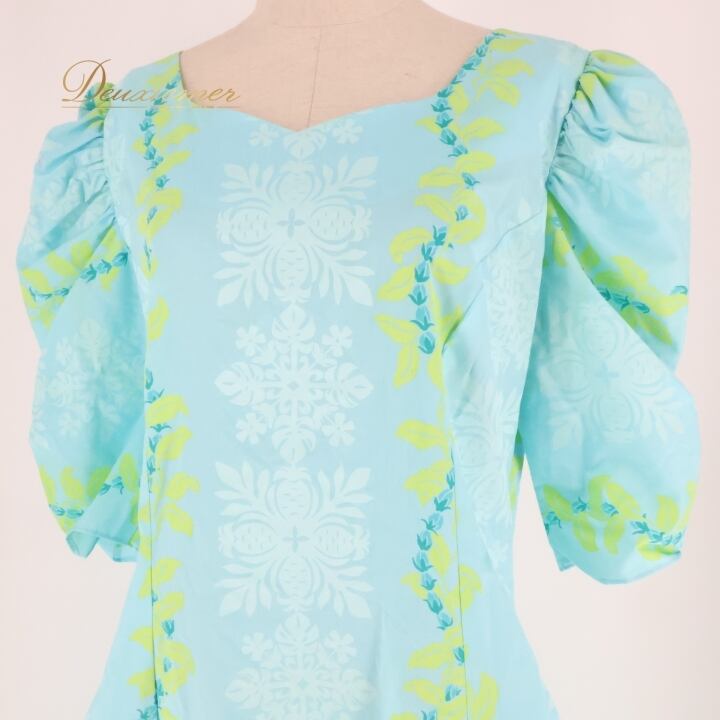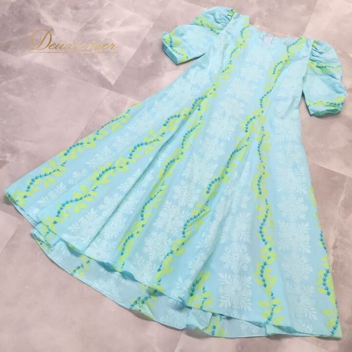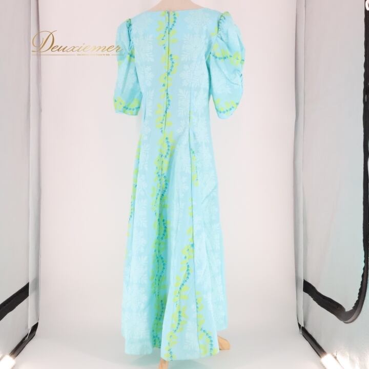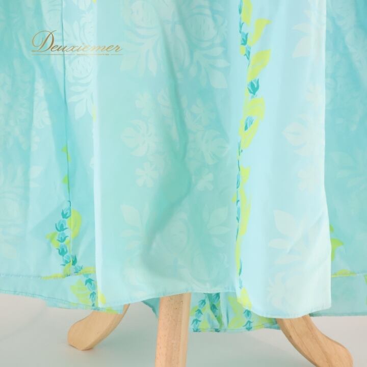 フラダンス 衣装 ワンピース ドレス ブルー系 水色 長袖 ギャザー アシンメトリー レイ柄 かわいい 華やか 鮮やか 明るい爽やか 水色 青 黄緑 ハワイアン アロハ ハワイアンプリント フラ ダンス レッスン 練習 ギャザースリーブ ハワイアンスタイル