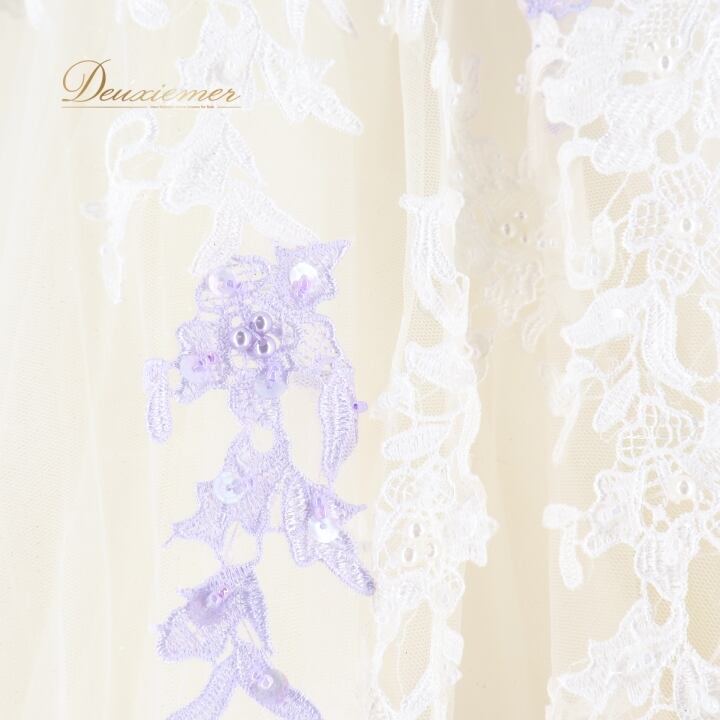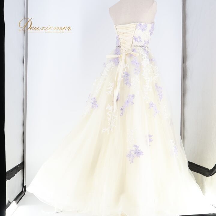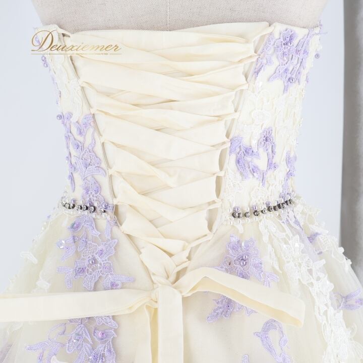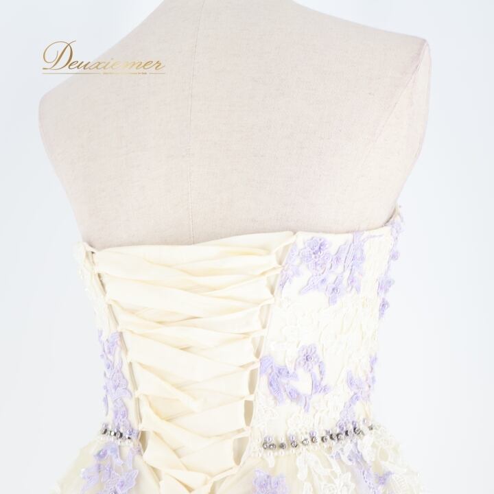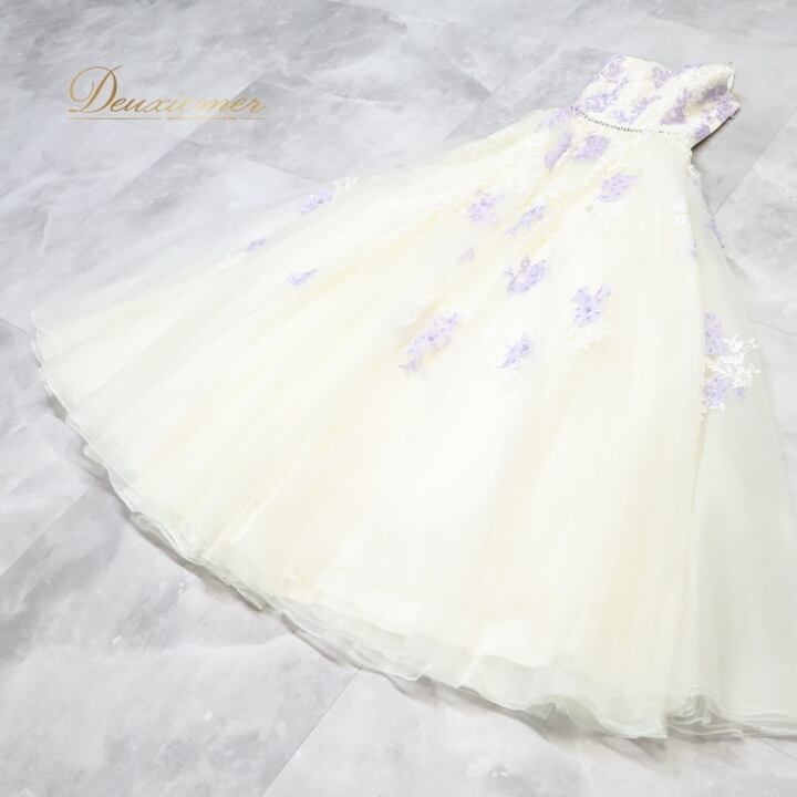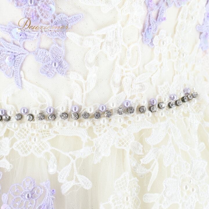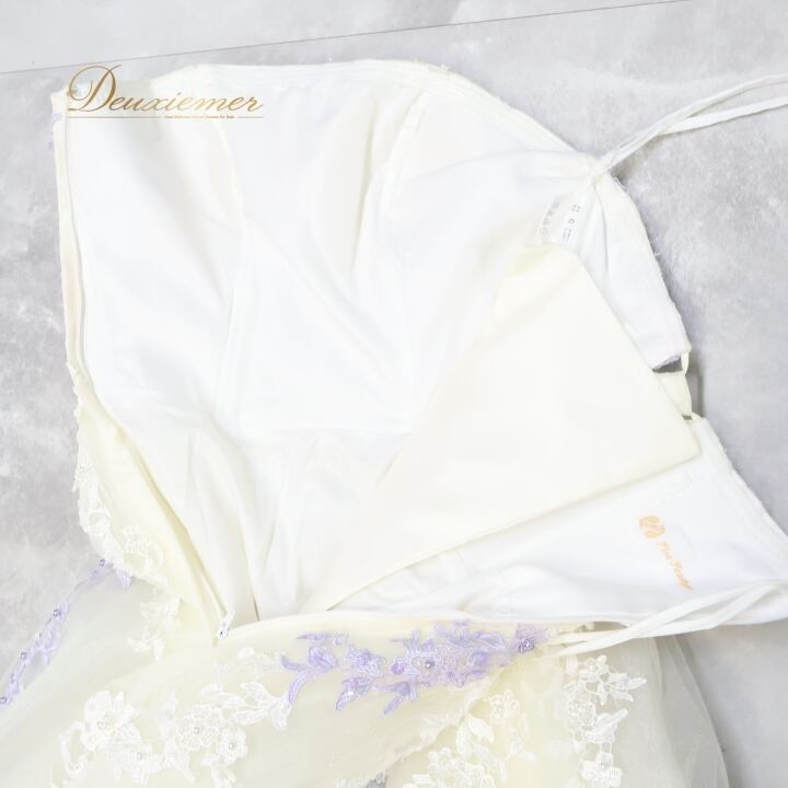 パーティドレス fine feathers ファインフェザーズ 前撮り 披露宴 結婚式 白 アイボリー 紫 レース ビーズ 発表会 演奏会 撮影 花嫁 ワンピース ドレス ホワイト系 パープル系 かわいい 優しい色合い 編み上げ フェミニン おしゃれ イベント用