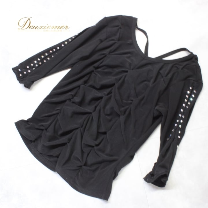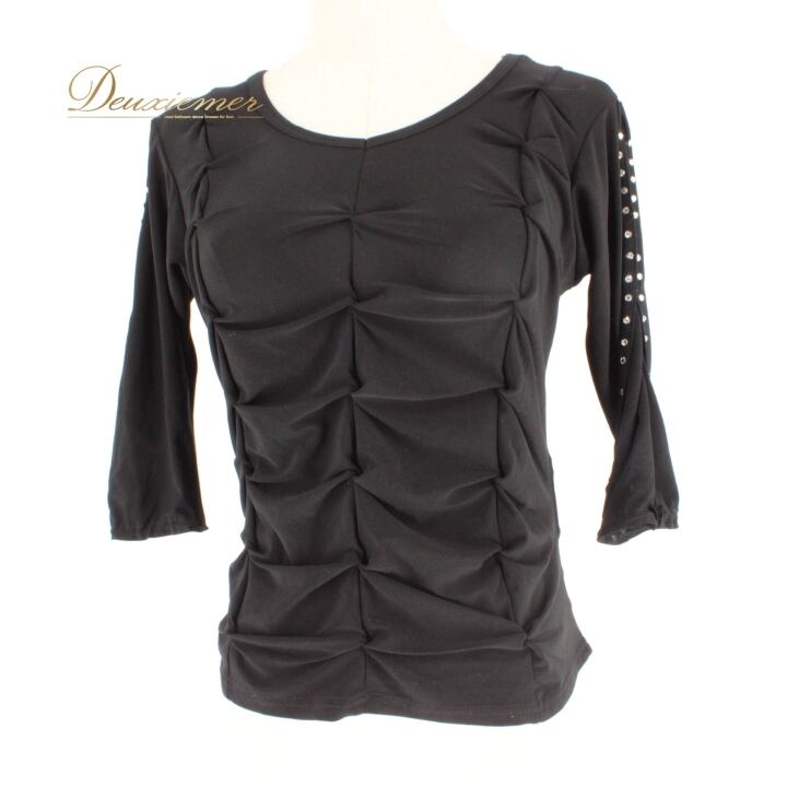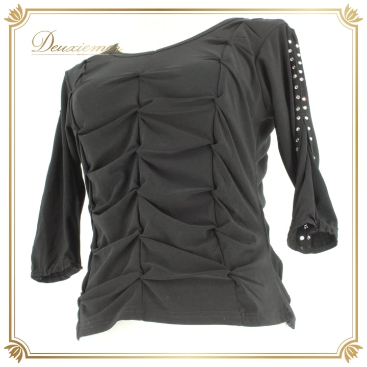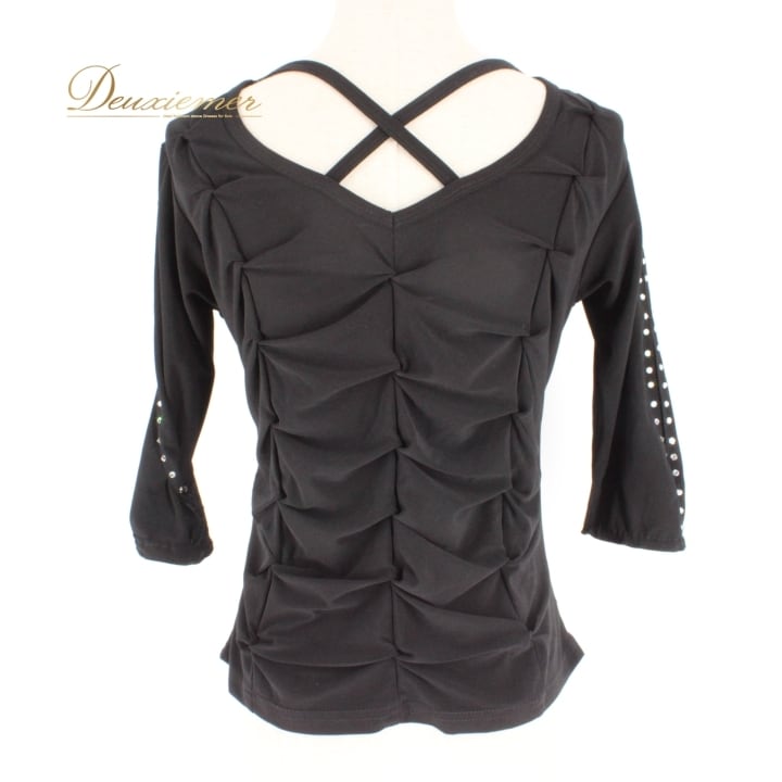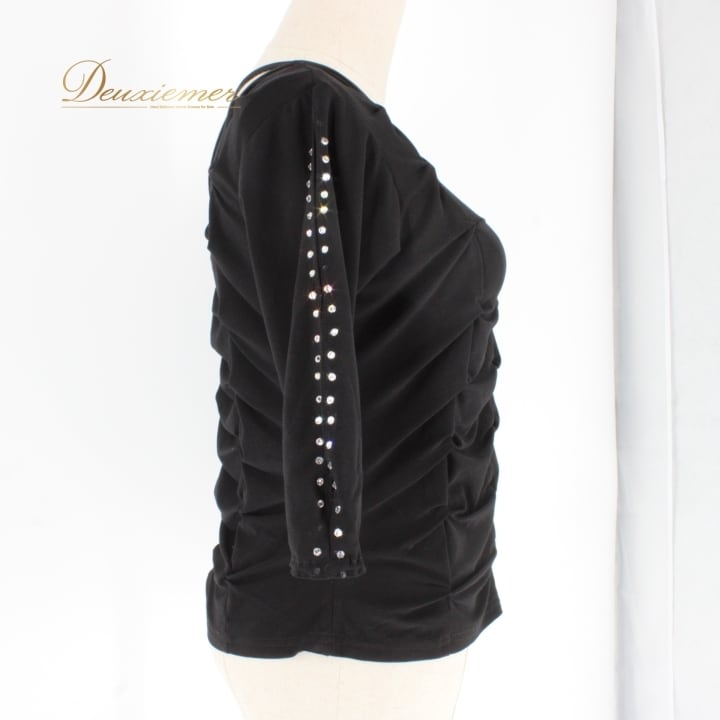 社交ダンス 衣装 スタンダード トップス レッスンウェア レディース Create-Sun クリエイトサン 練習着 ブラック系 黒 ラインストーン 無地 伸縮性 フィット感 シンプル モノトーン おしゃれ アシンメトリー 袖あり スタイリッシュ ダンスウェア 衣装 ブラック トップス レディース用 発表会 練習用 エレガント ステージ衣装