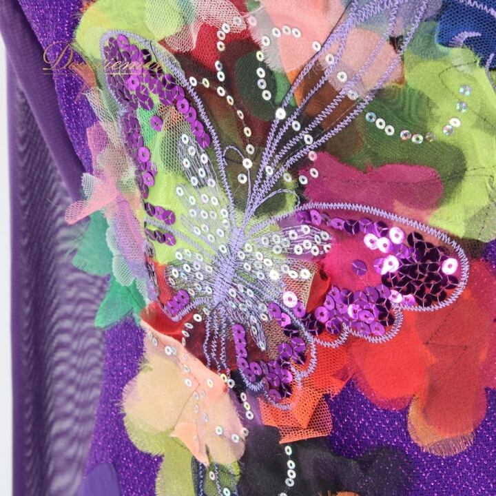 社交ダンス 衣装 スタンダード ドレス ワンピース レッスンウェア パーティドレス un×2 紫 パープル系 スパンコール 蝶 長袖 チョーカー レース スカート 二重 ふんわり 大人 バイオレット 踊りやすい おしゃれ ドレスアップ セクシー デザイン ハンドメイド 高品質 軽量 柔らかい おすすめ