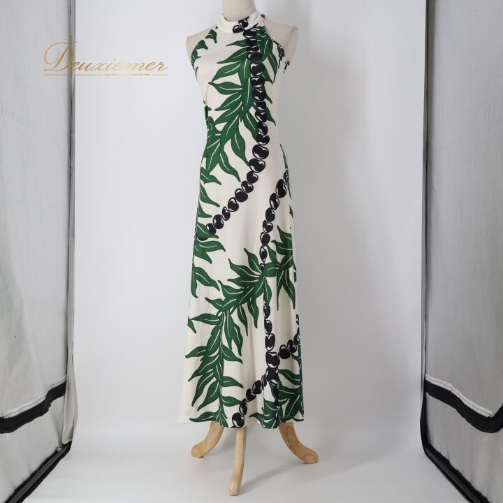 フラダンス 衣装 ワンピース ドレス ホワイト系 IMua ハワイアンプリント アロハ フラ ダンス レッスン 練習 ノースリーブ リボン ハイネック 華やか 鮮やか かわいい おしゃれ 上品 大人っぽい グリーン系 ブラック系 白 緑 黒 フレア ロング丈 スポーツウェア パーティー ドレスアップ