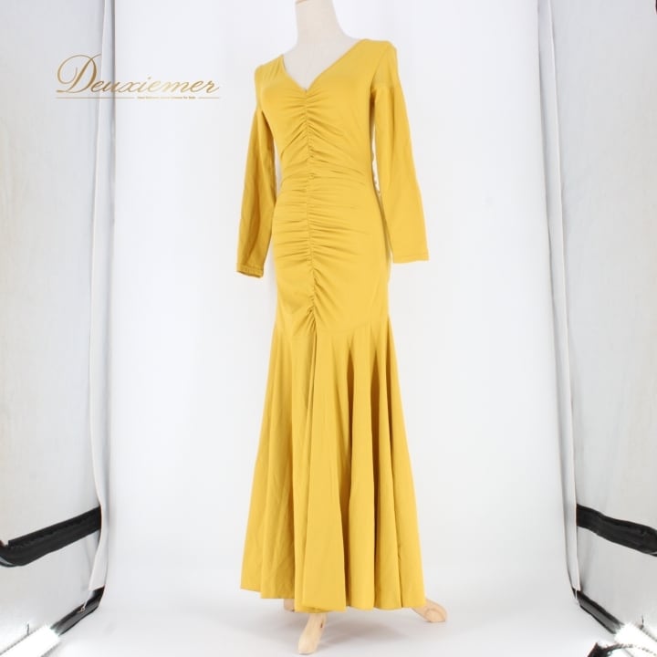 社交ダンス 衣装 スタンダード ドレス ワンピース パーティドレス イエロー系 ギャザー マスタード からし色 YILINFEIER 無地 シンプル ダンスドレス 長袖 伸縮性 美しい裾 大人用 ステージ衣装 フラットなデザイン シンプルスタイル フェスティバル スポーツ衣装 ルームウェア パーティー 衣装用 アイテム