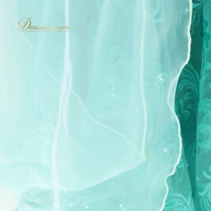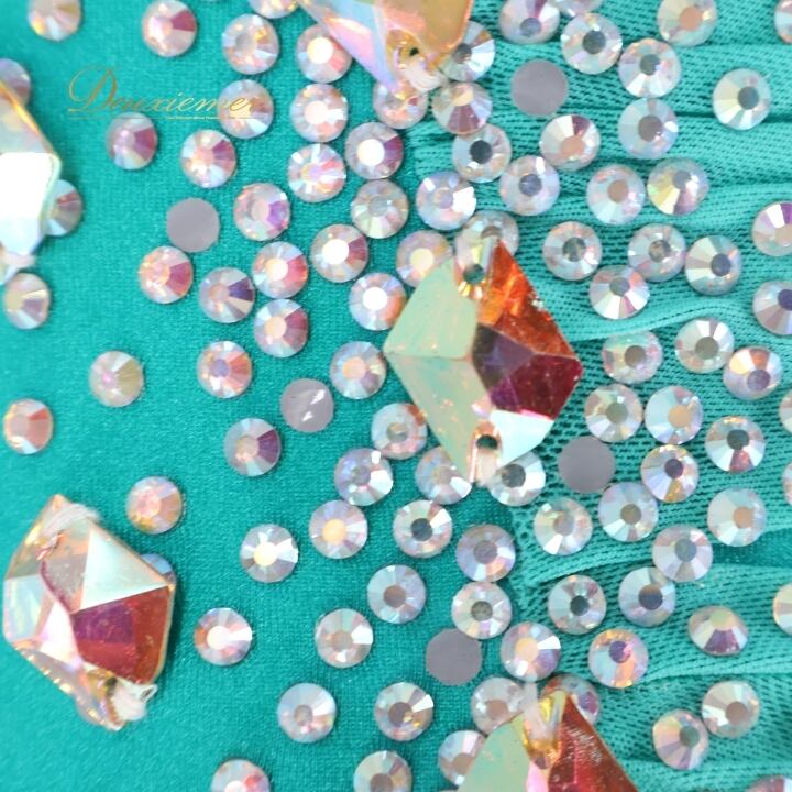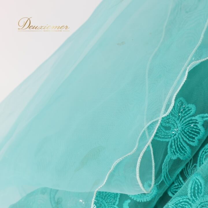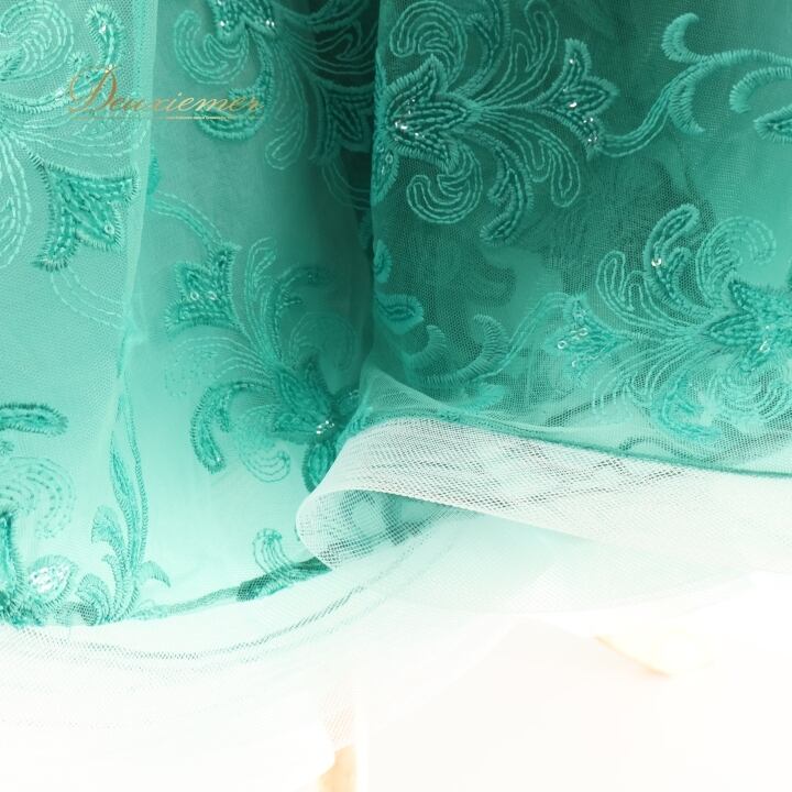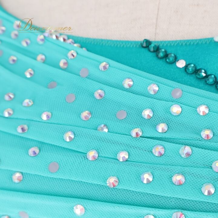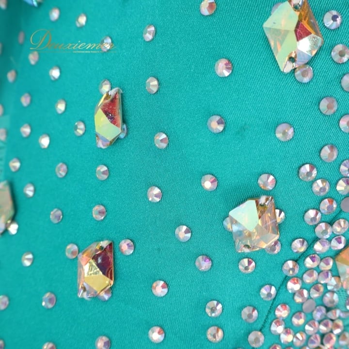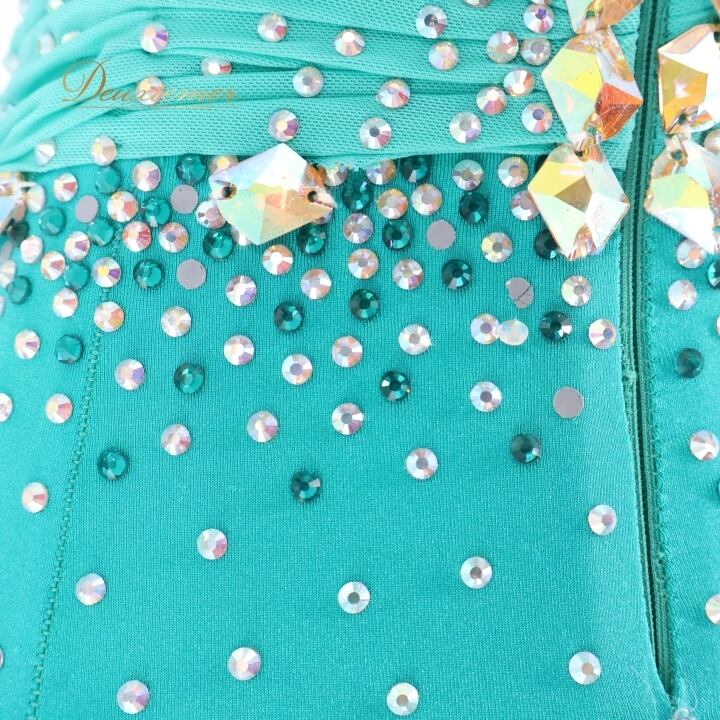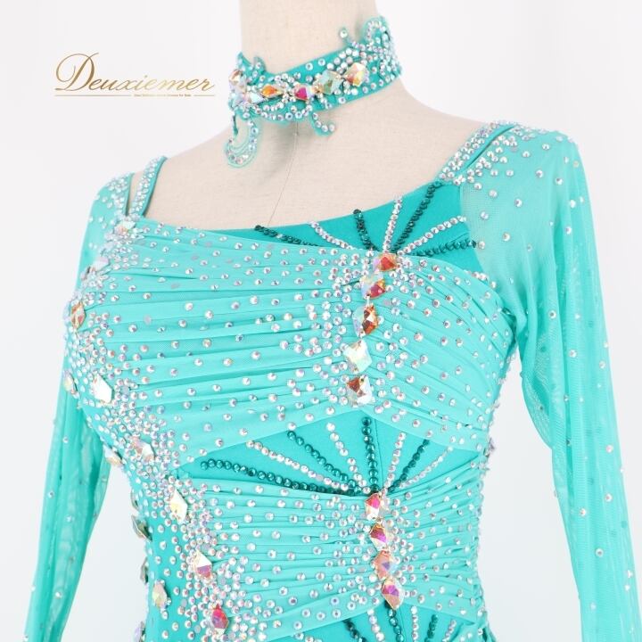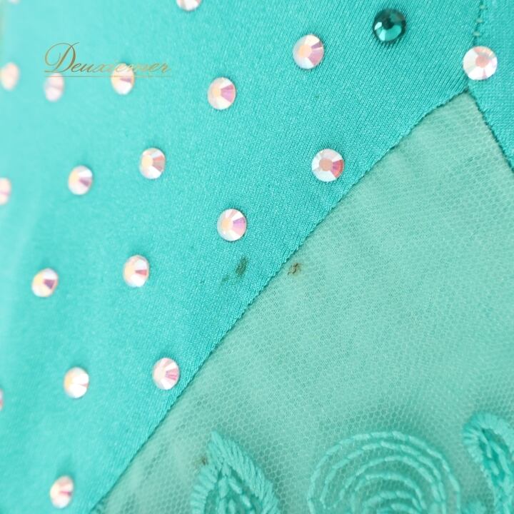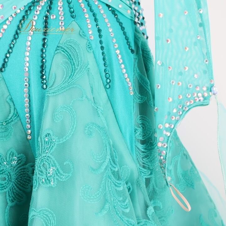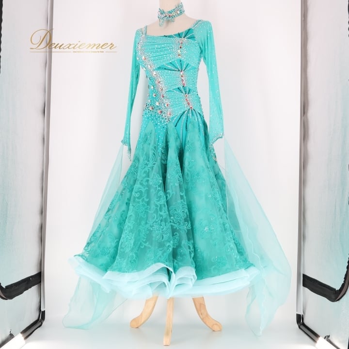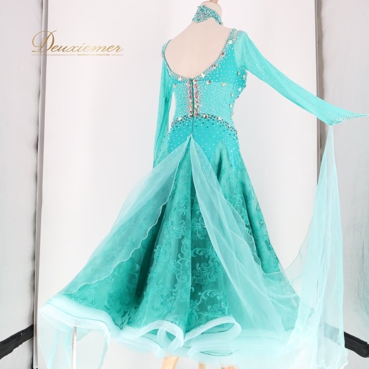 社交ダンス 衣装 スタンダードドレス ワンピース ドレス グリーン系 ブルー系 VeRTigo フリル レース フロート 青緑 デモ 競技 ダンス パーティ 発表会 豪華 華やか エレガント 上品 パフォーマンス用