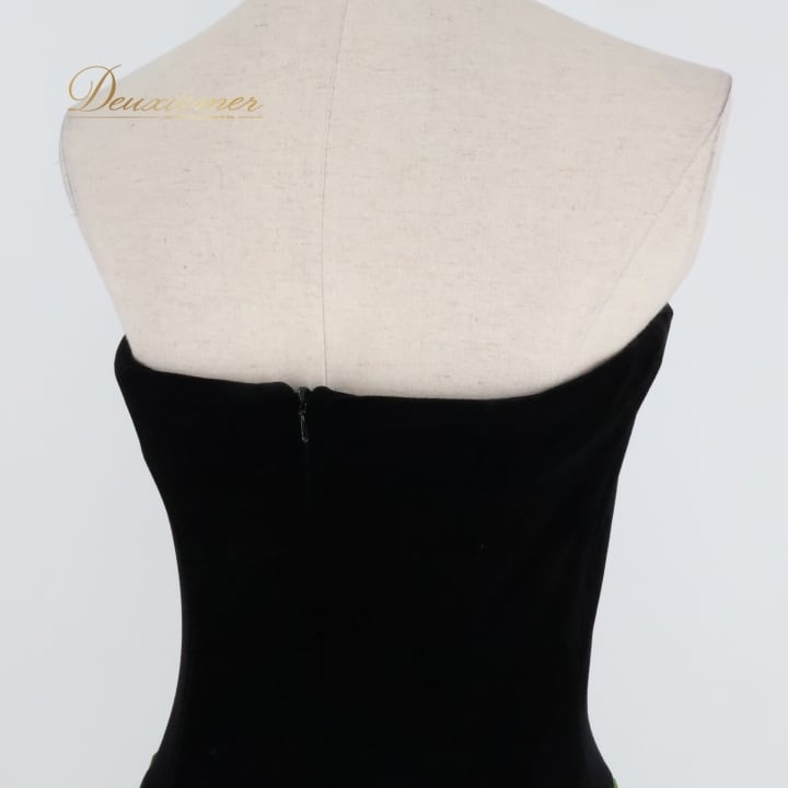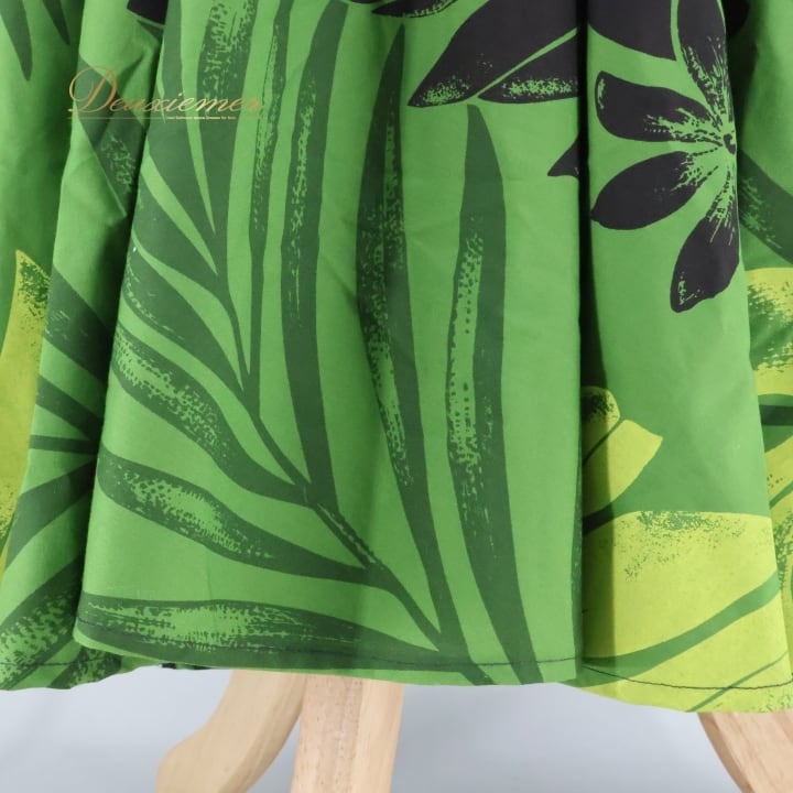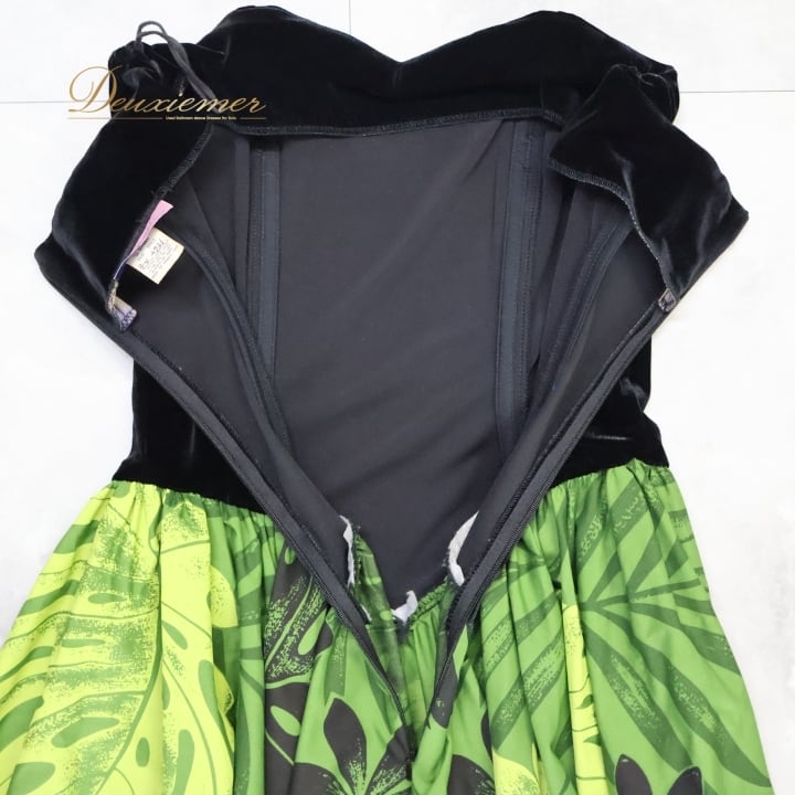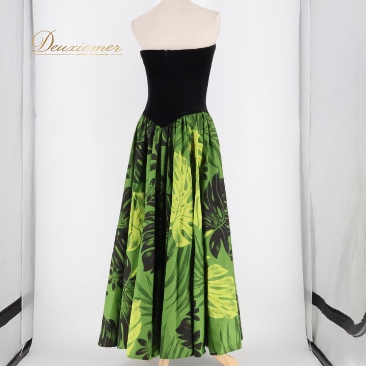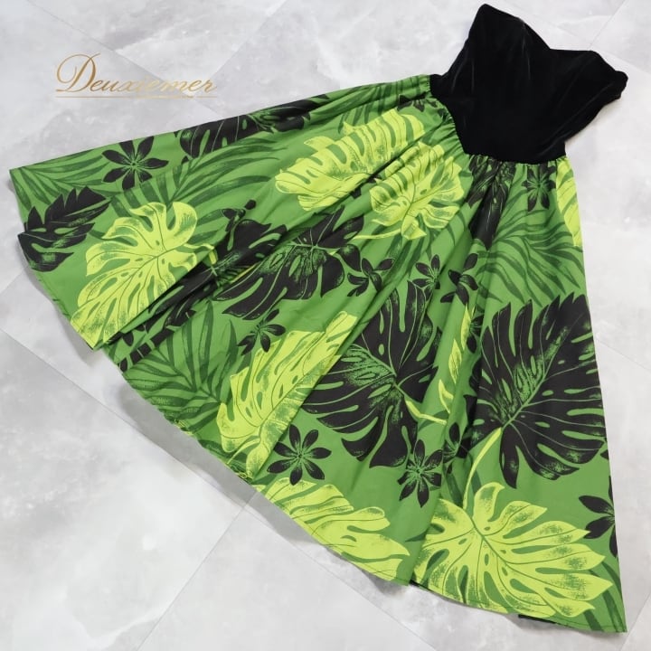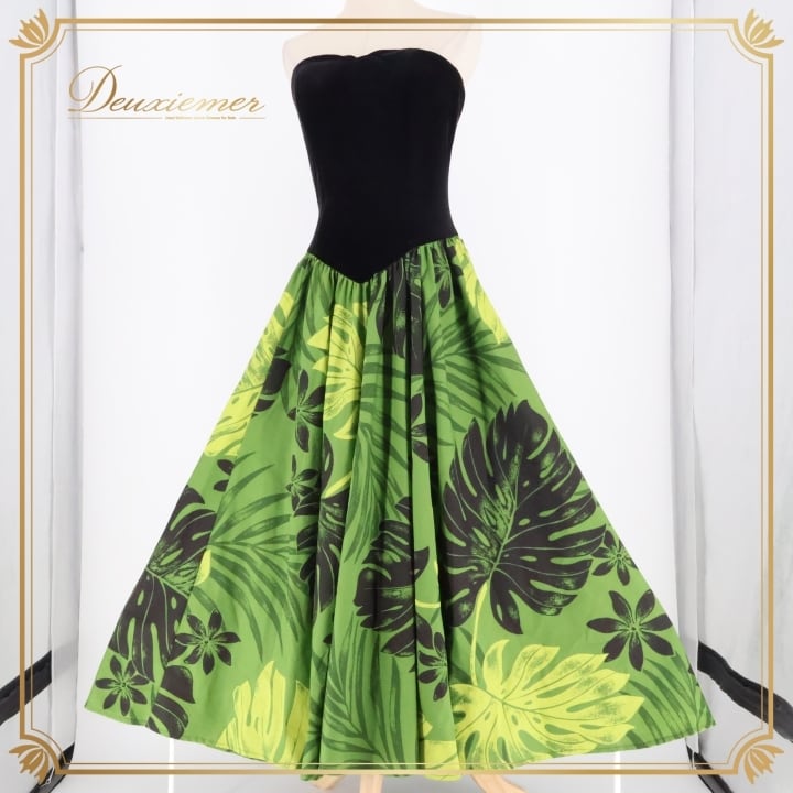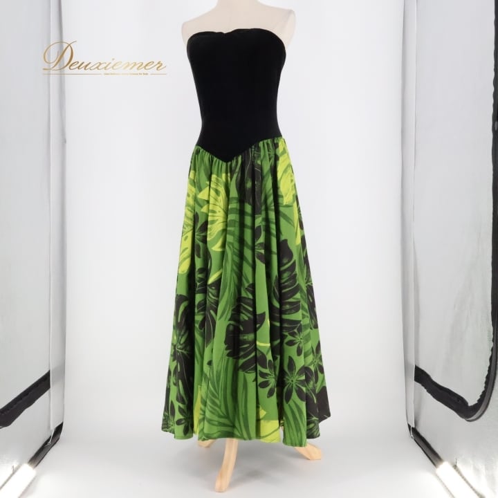フラダンス 衣装 ワンピース ドレス u'ino! ブラック系 グリーン系 ハワイ製 ベロア チューブトップ 異素材 かわいい 華やか 鮮やか 高級感 光沢 上品 きれい 黒 緑 ハワイアン アロハ ハワイアンプリント フラ ダンス レッスン 練習 おしゃれ