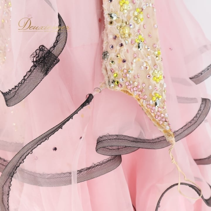 社交ダンス 衣装 スタンダードドレス ワンピース ドレス ピンク系 ピンク 黒 フロート レース フリル レース デモ 競技 ダンス パーティ 発表会 ビジュー 可愛い おしゃれ 舞台 競技用ダンスドレス パフォーマンス レディース