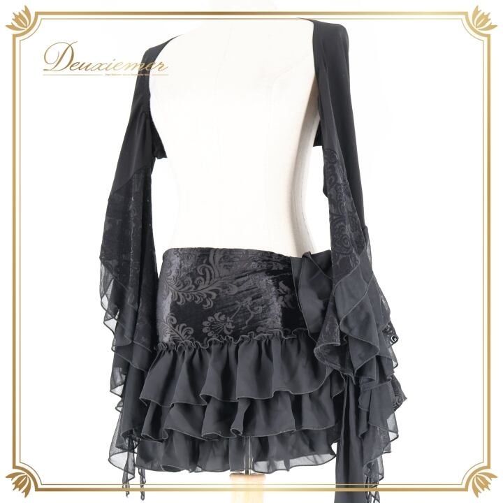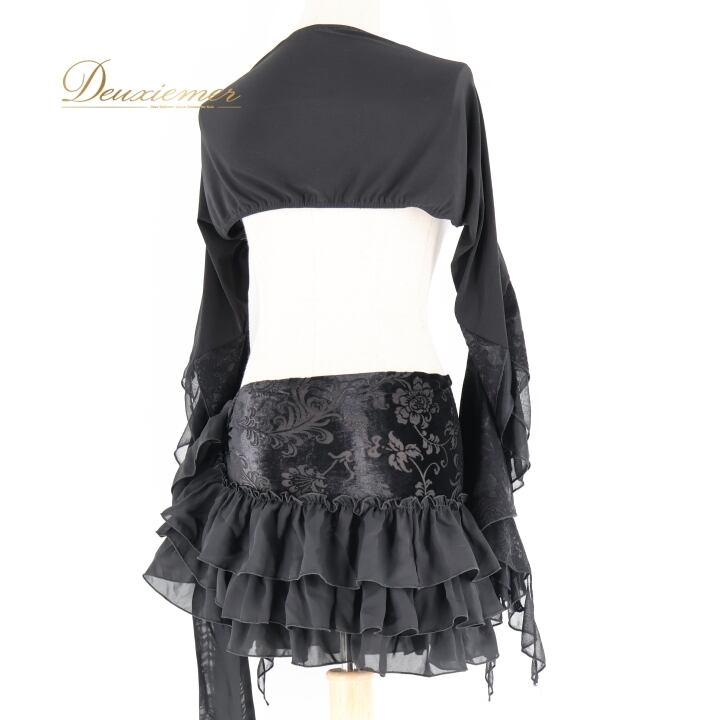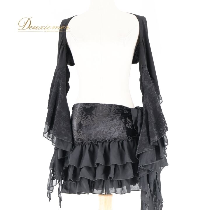 ベリーダンス 衣装 上下セット ブラック系 トップス ヒップスカーフ セット 黒 フリル 羽織り 練習 レッスン 伸縮 ストレッチ イベント ダンス衣装 かわいい かっこいい 華やか 模様 柄 ボリューム