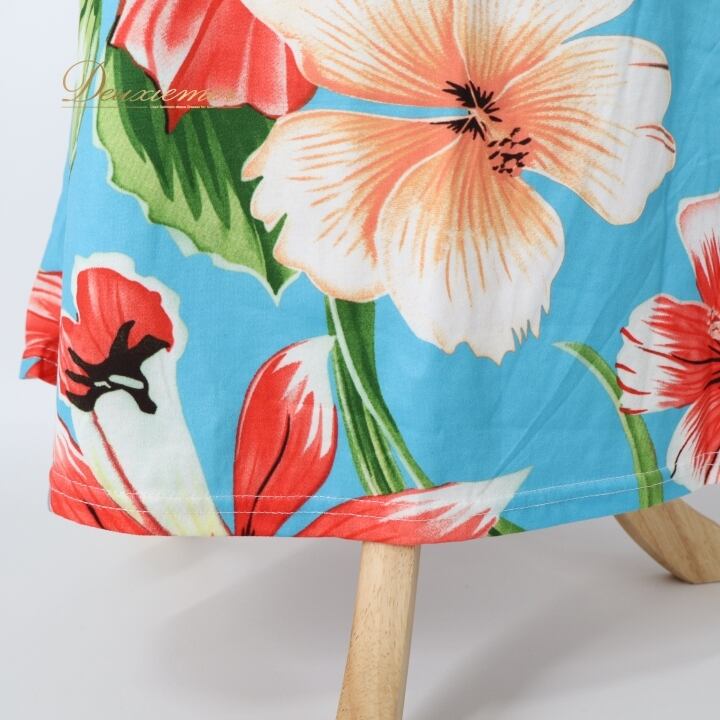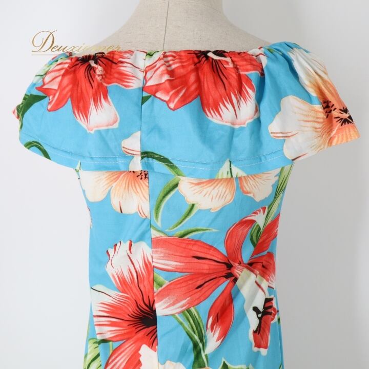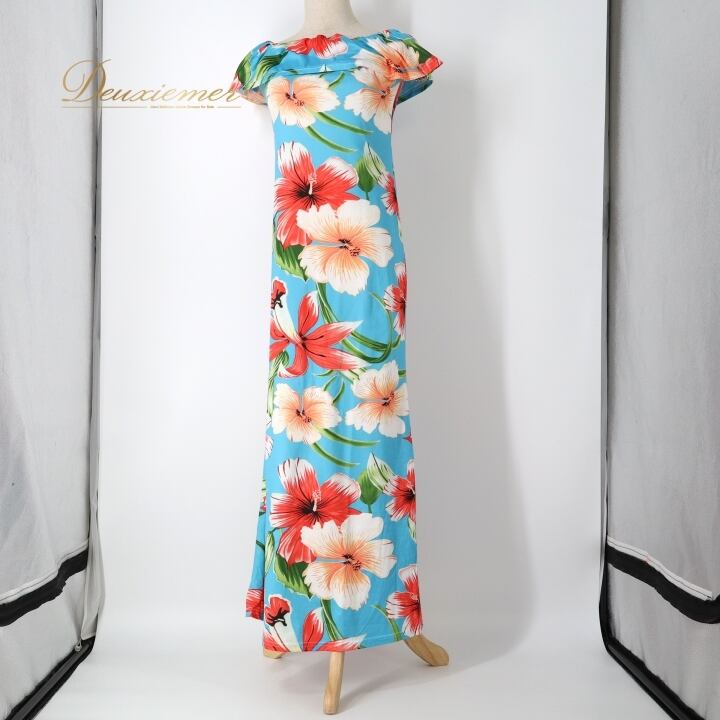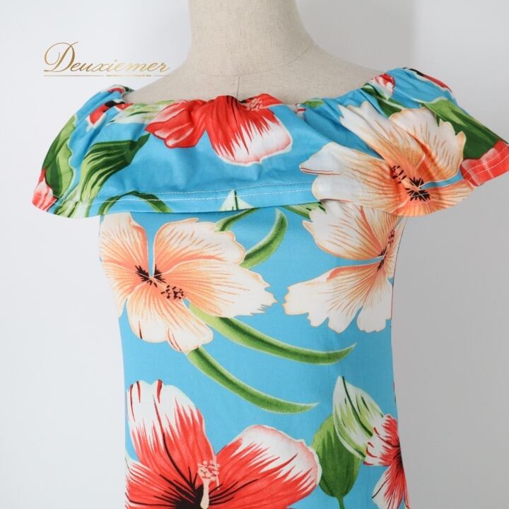フラダンス 衣装 ワンピース ドレス ブルー系 ハイビスカス柄 ハワイアンプリント アロハ フラ ダンス レッスン 練習 フリル 水色 花柄 植物柄 華やか 鮮やか かわいい おしゃれ さわやか 上品 大人 大人っぽい レッド系 ホワイト系 グリーン系 オレンジ系 フラダンス用ドレス サマーウェア リゾートスタイル エレガント ドレスアップ 女性用 大人用 ロングドレス 軽やか 柄物 可愛いデザイン