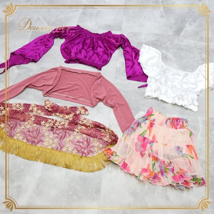 ベリーダンス 衣装 まとめ売り 全5点 セット トップス スカート ヒップスカーフ 花柄 無地 シンプル 練習 レッスン フリンジ 紫 白 黄 かわいい Garam garam ガラムガラム miyamiya パープル系 ピンク系 イエロー系 ホワイト系