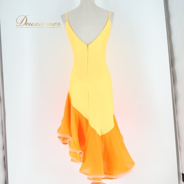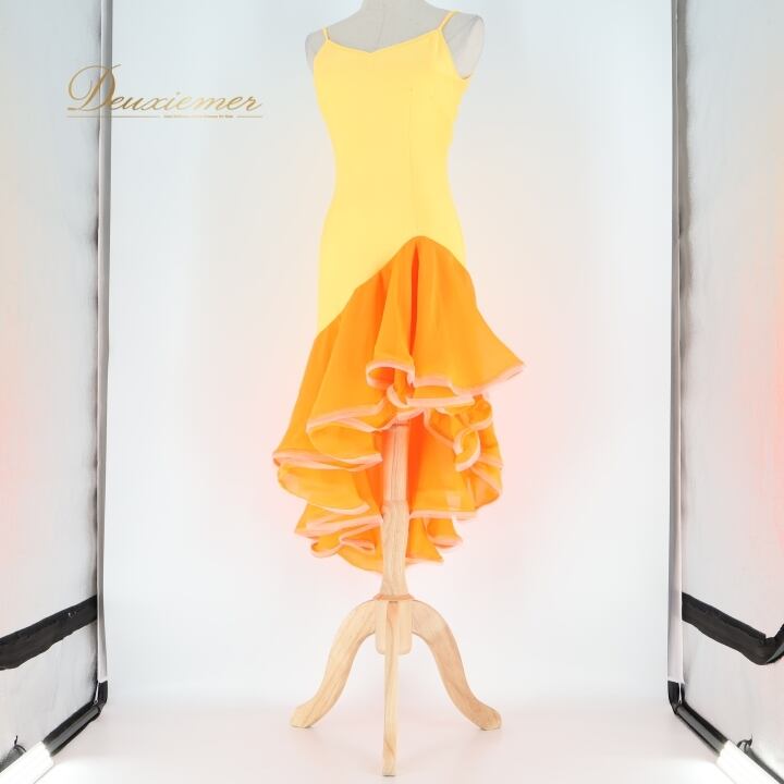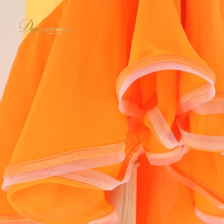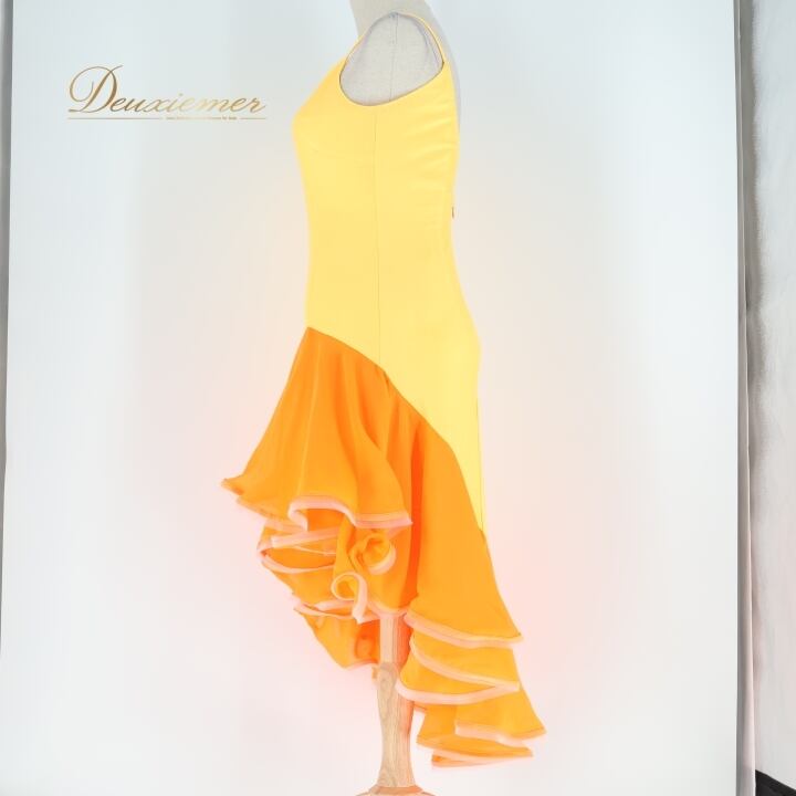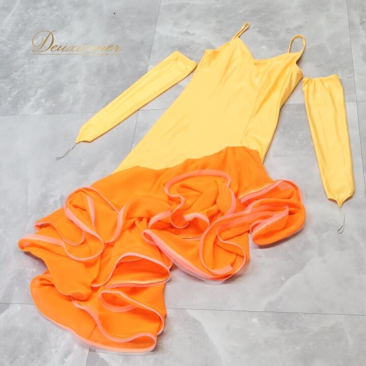 社交ダンス 衣装 ラテン ドレス ワンピース イエロー系 オレンジ系 黄色 オレンジ 無地 フリル レース 伸縮 ストレッチ 発表会 デモ 競技 パーティ 可愛い