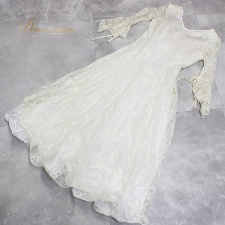 #社交ダンス #ドレス #社交ダンス衣装 #ダンスコスチューム #花柄レース #ホワイトドレス #二重スカート #ボリューム感 #優雅 #ラインストーン #伸縮性 #ファッション #パーティードレス #ダンスファッション #特別な日 #女性用トルソー #品質表示 #レイリーナ #ナイロン素材 #ENUTSU