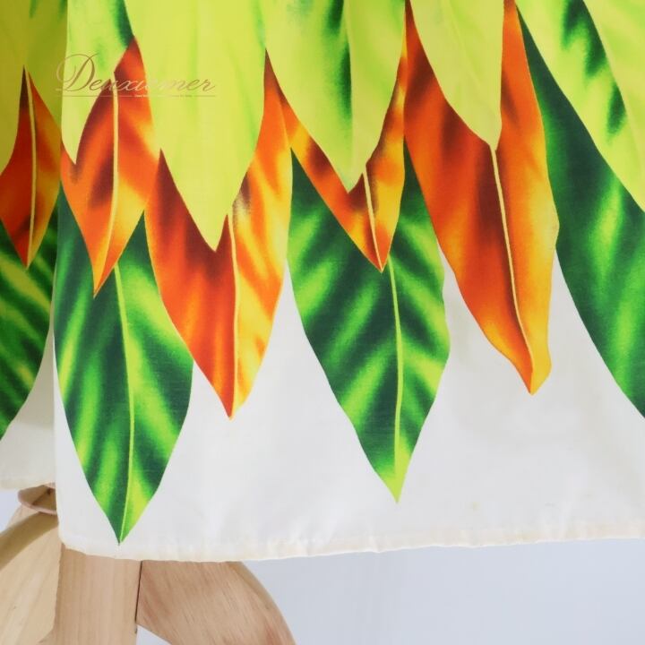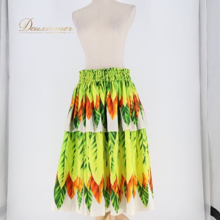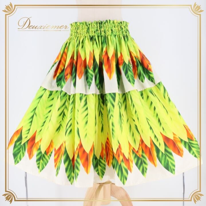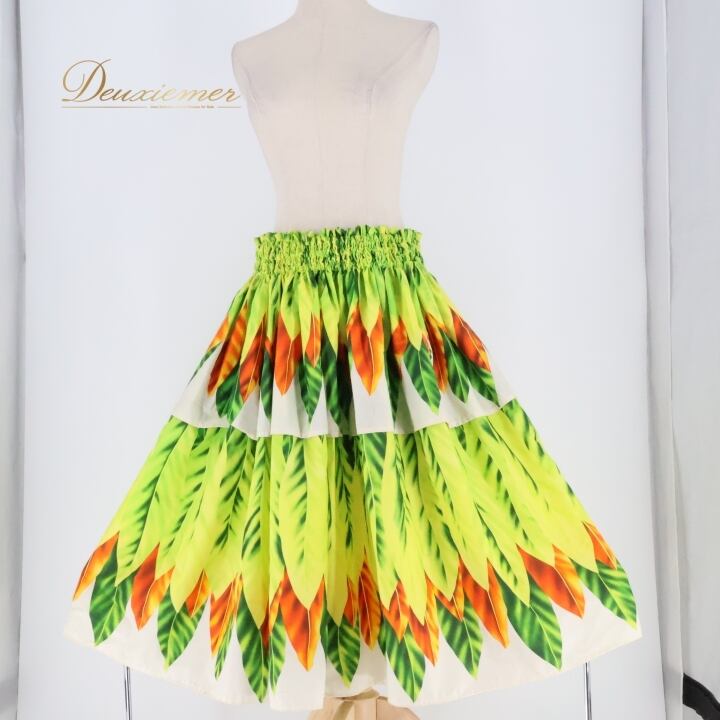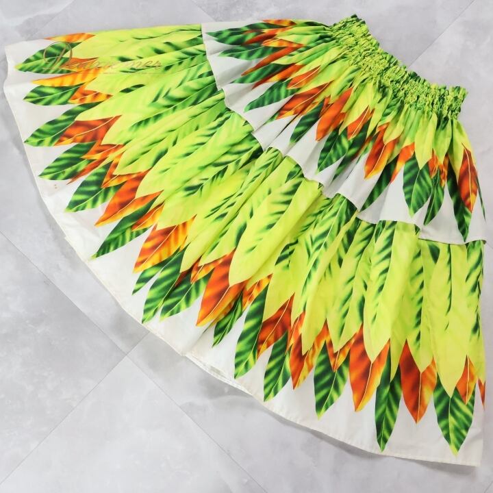 フラダンス 衣装 パウスカート イエロー系 シングル リーフ柄 ティーリーフ柄 カラフル かわいい 華やか 鮮やか 明るい 黄 橙 緑 シンプル ハワイアン アロハ ハワイアンプリント フラ ダンス レッスン 練習 オレンジ系 グリーン系 フラガール 明るい色