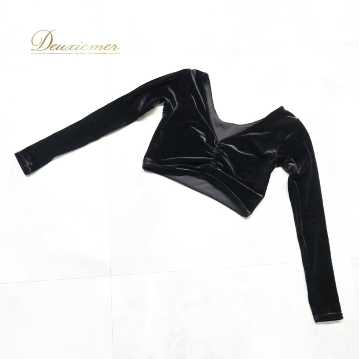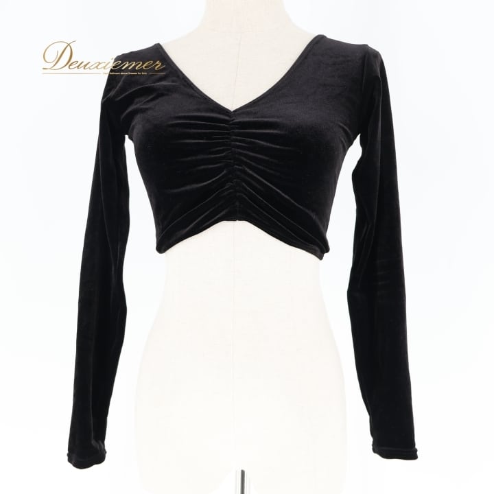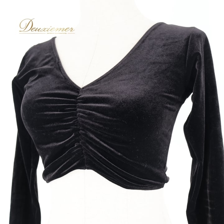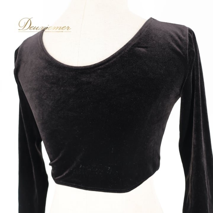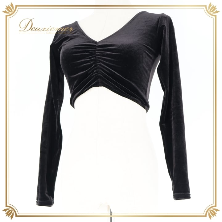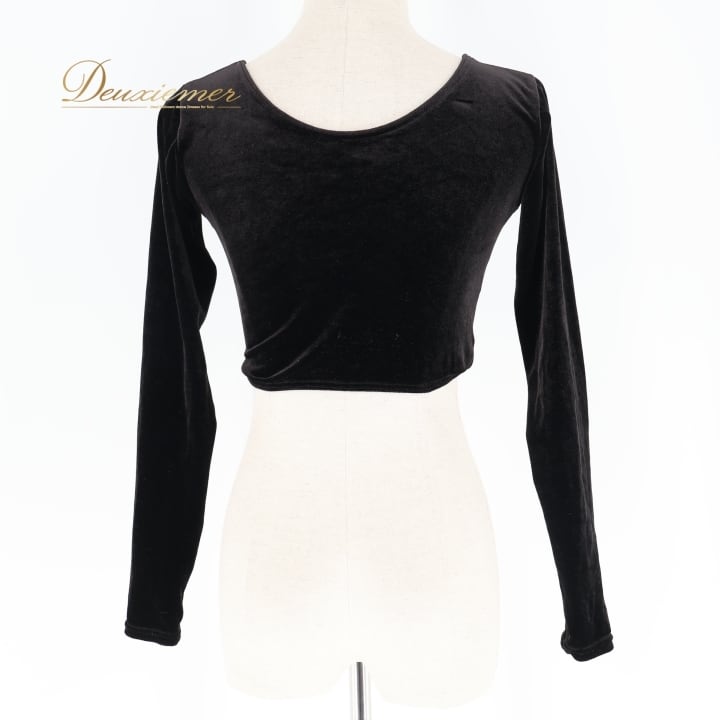 社交ダンス 衣装 トップス ブラウス ブラック系 チャコット Chacott 黒 日本製 ベロア ショート丈 長袖 練習 レッスン 伸縮 ストレッチ 無地 シンプル 上品 短め かわいい 光沢 高級感 ダンス衣装 イベント ステージ パーティー オールブラック