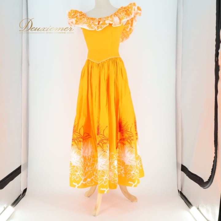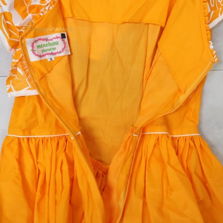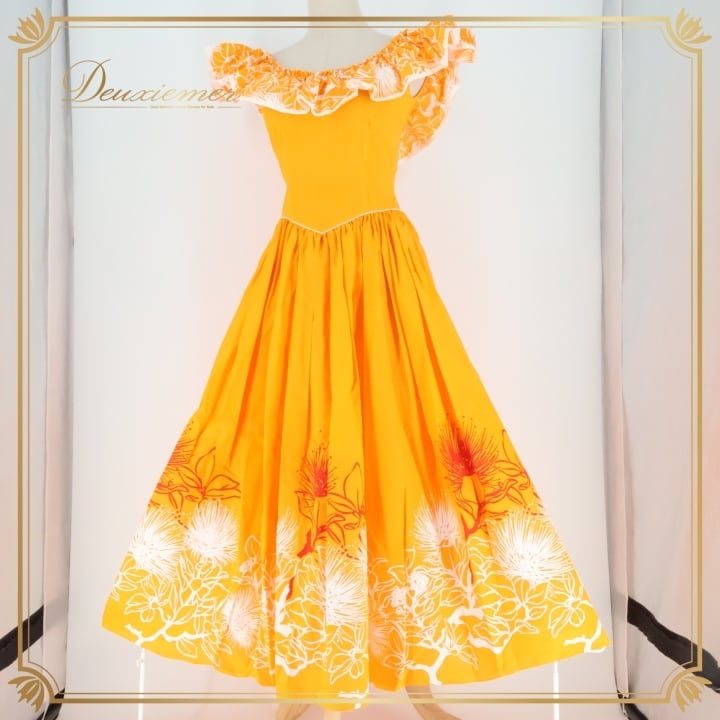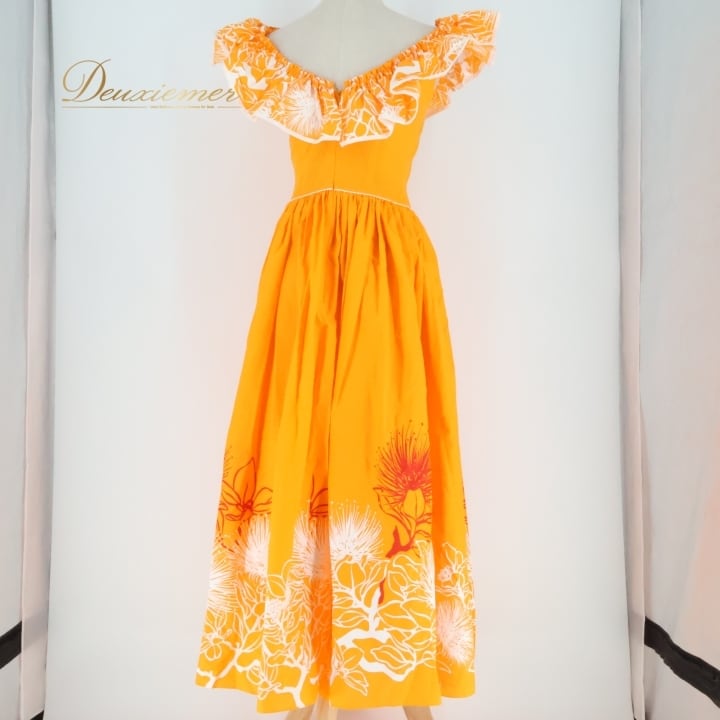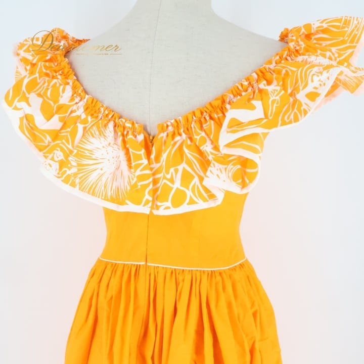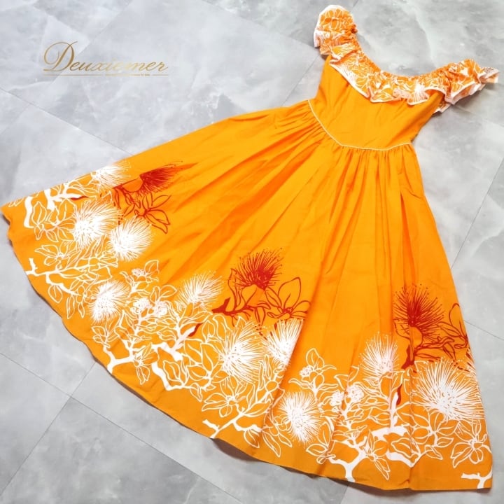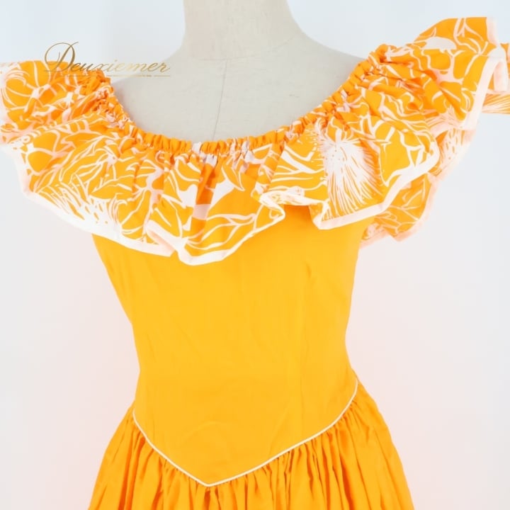 #フラダンス #衣装 #ドレス #ワンピース #日本製 #オレンジ #鮮やか #デザイン #メネフネプランテーション #サイズ2 #背面ファスナー #伸縮性無し #ポリエステル #綿 #女性用トルソー #ダンス #フラダンス衣装 #特別な日 #おしゃれ #ENUTSU