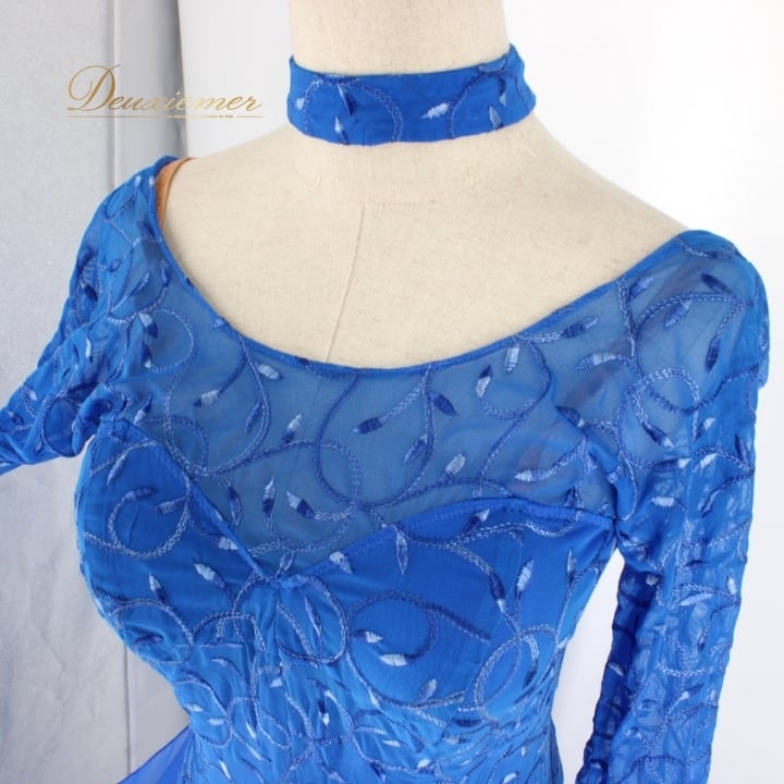社交ダンス 衣装 スタンダード ドレス ワンピース パーティドレス レディース 青 フロート ブルー系 チョーカー 長袖 カラードレス 準正装 ロイヤルブルー シルエット ふんわり 広がる 二重スカート 動きに合わせて揺れる 女性用 練習着 イベント用 フォーマル 発表会 おしゃれ かわいい エレガント 上品 レディースファッション