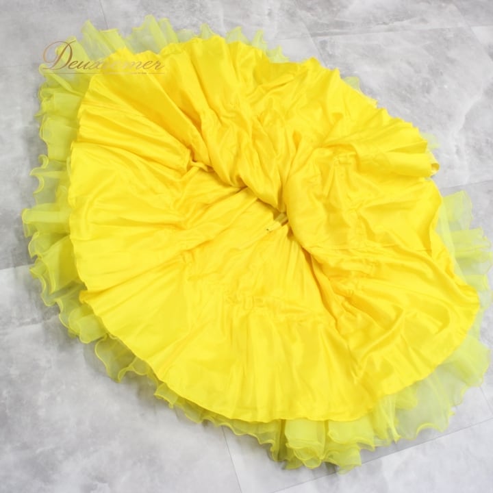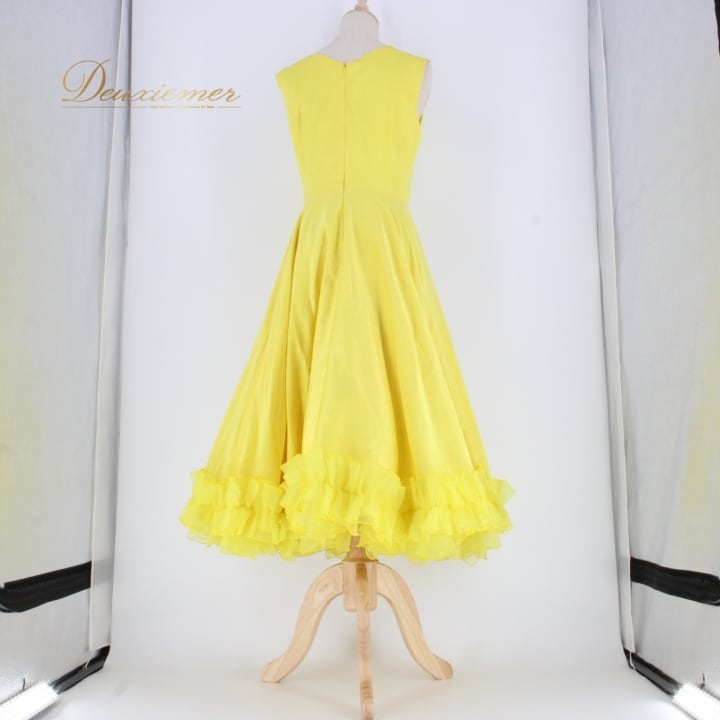 社交ダンス 衣装 スタンダード ドレス ワンピース パーティドレス Bright Proceed ブライトプロシード 黄色 フリル イエロー系 無地 準正装 フレッシュ 授賞式 結婚式 体型カバー 大人可愛い 上品 モダン ドレスアップ カジュアル おしゃれ かわいい イベント 演出 競技会 夏 用 さらっとした素材 変身 服装 マッチング 【9号】