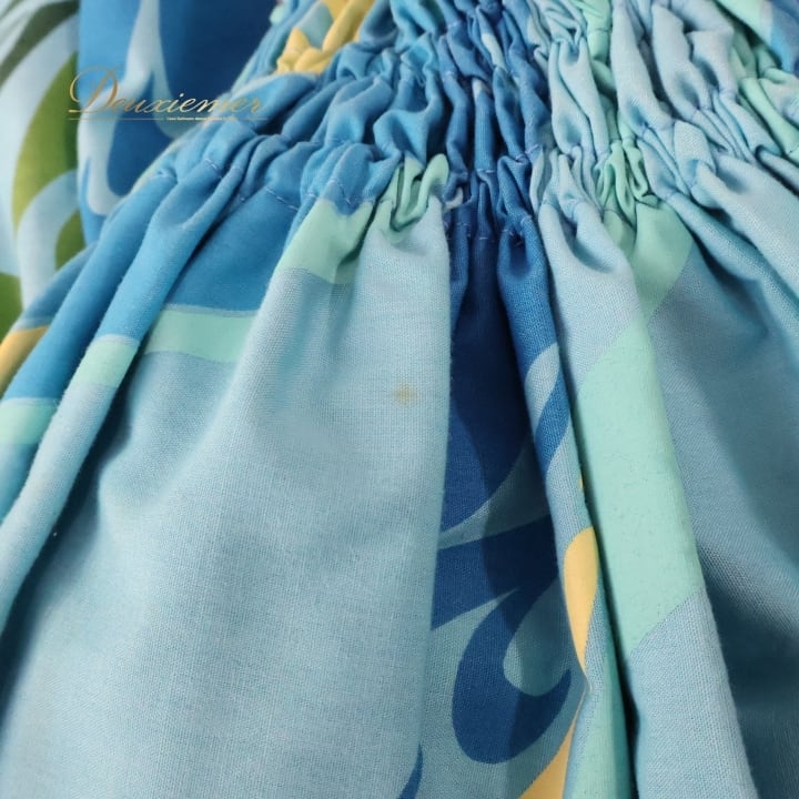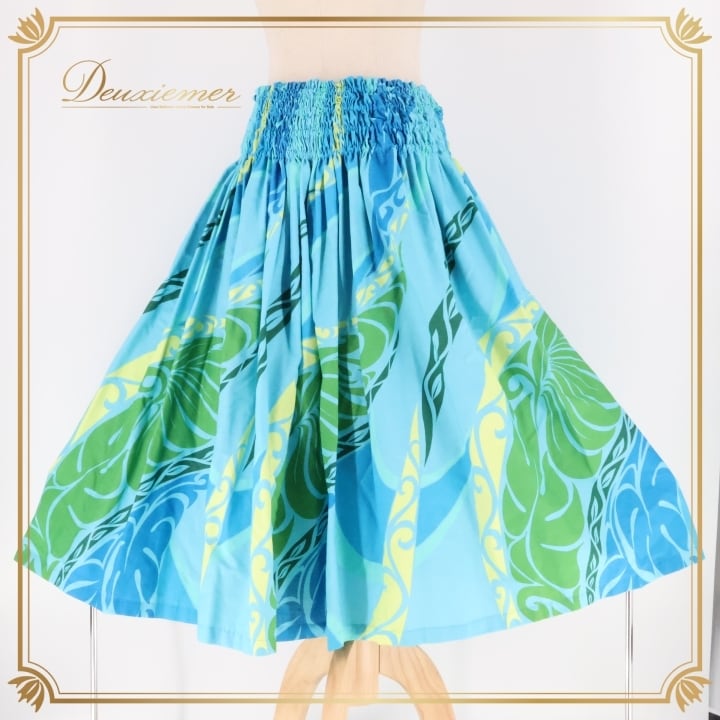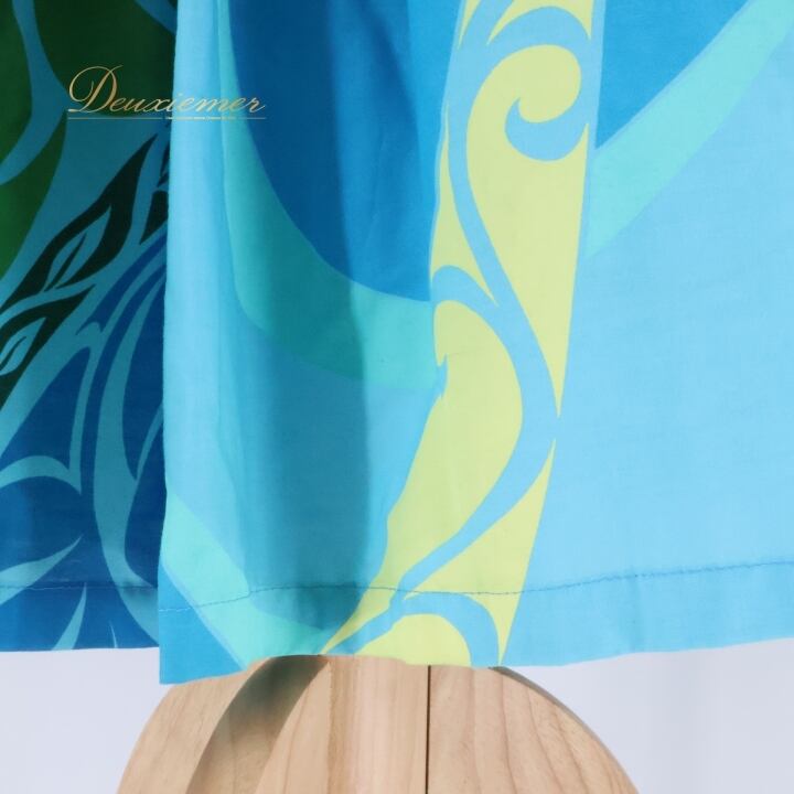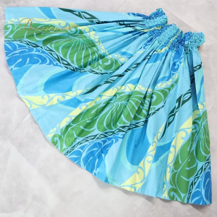 フラダンス 衣装 パウスカート ブルー系 カヒコ柄 シングル シンプル かわいい 華やか 鮮やか 明るい 水色 緑 黄 ハワイアン アロハ ハワイアンプリント フラ ダンス レッスン 練習 スカート フラダンス衣装 可愛い 爽やか ハワイアン柄