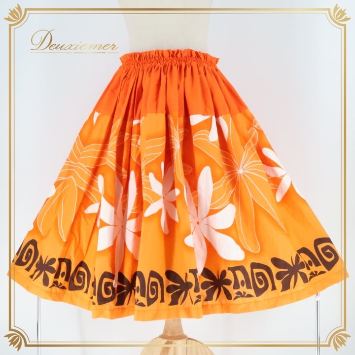 フラダンス 衣装 パウスカート スカート オレンジ系 ティアレ柄 カヒコ柄 シングル シンプル かわいい 華やか 鮮やか 明るい 橙 白 茶 ハワイアン アロハ ハワイアンプリント フラ ダンス レッスン 練習 レディース 花柄 ハワイアンスタイル カラフル